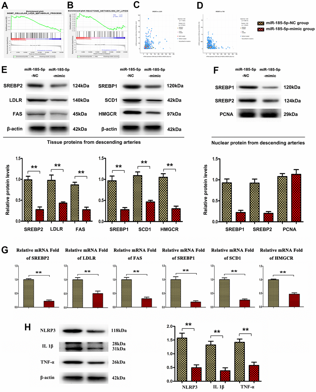 To examine the effects of MiR-185-5p on lipid metabolism at the molecular levels, the expression of significant regulators involved in lipid metabolic processes was evaluated. Firstly, GSEA enrichment analysis predicted that the abnormal regulation of core differential genes was related to some important biological processes. The annotated gene sets were c2.cp.reactome.v7.4.symbols.gmt and c5.go.bp.v7.4symbols.gmt. According to the P value, the pathways with significant difference enrichment were screened, and the pathways inhibited by two genes were selected as the possible pathways. The results suggest that it is enriched in signaling pathways such as lipid metabolism pathway (Figure 1A, 1B). Furthermore, co-expression analysis revealed that LDLR and FAS were significantly correlated with SREBP2 in atherosclerosis (Figure 3C, 3D). We then examined the mRNA and protein expression of LDLR, FAS, and SREBP2 as well as SREBP1, SCD1, HMGCR, the lipid metabolic proteins [25, 26, 28, 29], in the lesions of atherosclerotic aortas from apoE-/- mice with HFD in tissue as well as nuclear proteins, shown in Figure 3E, 3F. The SREBP2 directly combine with the activation of NLRP3, the powerful inflammation activator in AS, therefore the associated inflammatory factors IL-1β, TNF-α were also tested by western blot. The miR-185-5p mimic inhibited these lipid biosynthesis and inflammatory factors vs miR-185-5p NC mice, data were shown in Figure 3E–3G (P<0.05).