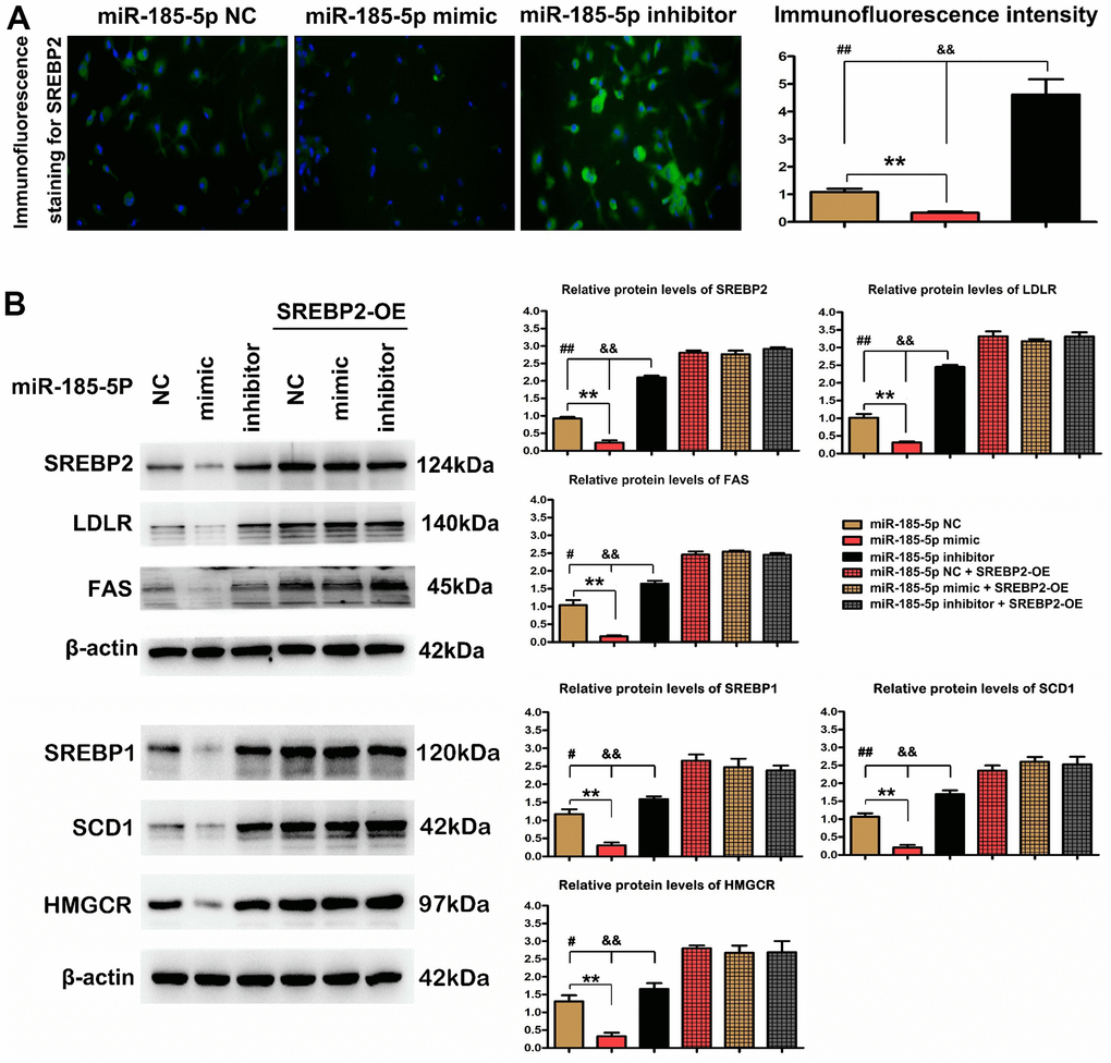 To further confirm the mechanisms of suppressive effect of miR-185-5p mimic on SREBP2 activation, macrophages were treated with ox-LDL to create an atherosclerotic environment in vivo. Immunofluorescence staining revealed that the administration of miR-185-5p mimic significantly down-regulated the expression of SREBP2, while the decreased expression of SREBP2 was recovered by miR-185-5p inhibitor. Western blotting analysis confirmed that miR-185-5p mimic reduced the protein expression of SREBP2 and its associated genes LDLR, and FAS, SREBP1c, SCD-1, and HMGCR in vitro. The results were further supported by quantitative analysis on relative protein levels, suggesting that miR-185-5p mimic specifically affects the activation of lipid metabolism-related genes in ox-LDL-stimulated macrophages. SREBP2-OE effectively reversed the protective role of miR-185-5p, namely, inhibiting its lipid metabolism-related genes via the SREBP2 activation. In summary, miR-185-5p suppressed the lipid deposition in lesional macrophages by inhibiting SREBP2 and its associated lipid modulatory proteins in the case of atherosclerosis.