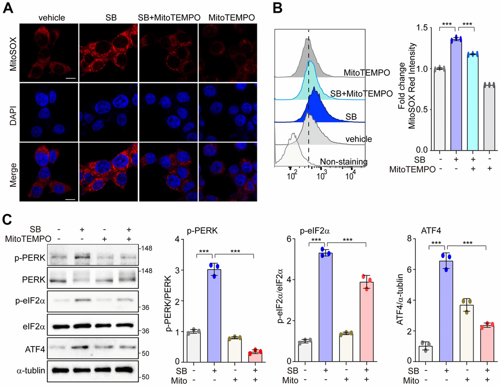 Low levels of mtROS can selectively activate the PERK/eIF2α/ATF4 axis to preserve cellular homeostasis [30–33]. Modulation of the PERK pathway may protect against neurodegeneration [7]. Thus, we first investigated whether SB202190-induced PERK activation was mediated by mtROS in human neuronal cells. In SH-SY5Y cells, treatment with SB202190 enhanced mtROS levels as detected using the mitochondrial superoxide indicator MitoSOX and analyzed by either confocal microscopy (Figure 2A) and FACS (Figure 2B). Conversely, SB202190 induced mtROS levels were diminished in cells treated with MitoTEMPO, an mtROS scavenger (Figure 2A, 2B). In accordance with observations in SH-SY5Y cells, we confirmed that SB202190 enhanced the generation of mtROS in HEK293 cells (Supplementary Figure 2A). To determine whether SB202190 treatment activates the PERK pathway via mtROS, the levels of phosphorylation of PERK, eIF2α, and ATF4 were measured in MitoTEMPO-treated SH-SY5Y and HEK293 cells. Scavenging mtROS efficiently reduced PERK pathway activation in SB202190-treated cells (Figure 2C and Supplementary Figure 2B). These data demonstrate that SB202190 treatment is effective in activating the PERK pathway via mtROS generation, specifically in neurons.
