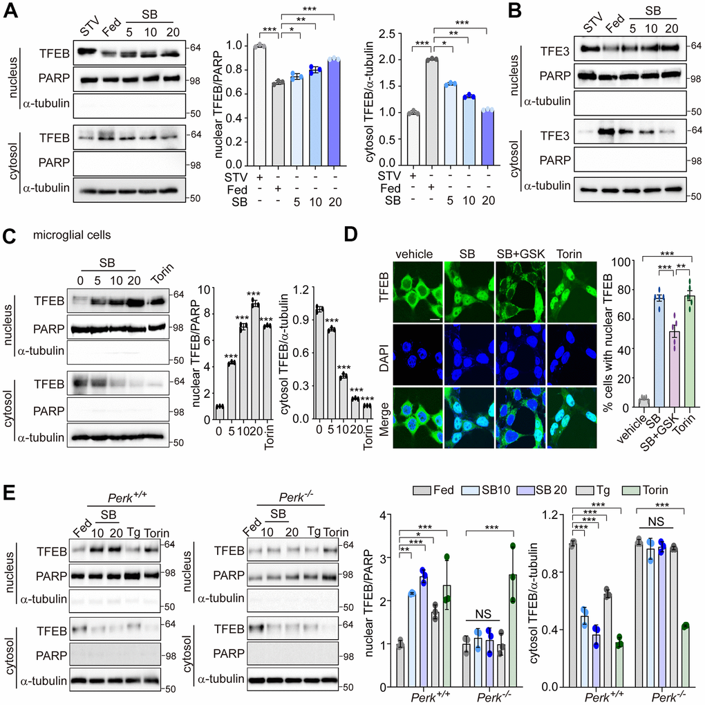 PERK is involved in translocation of TFEB into the nucleus to induce the autophagy-lysosomal pathway (ALP) [30]. In neuronal cells, the activation of ALP by an increase of TFEB nuclear translocation is critical to ameliorate amyloidogenesis. We investigated whether PERK regulates TFEB nuclear translocation in SB202190-treated SH-SY5Y cells. SB202190 induced a dose-dependent increase in TFEB nuclear translocation, as did starvation, compared to serum-fed cells (Figure 3A). TFE3 and TFEB are both members of the microphthalmia-associated transcription factor (MITF) family of the basic helix-loop-helix zipper family of transcription factors. Thus, we investigated the effects of SB202190 on TFE3 nuclear translocation. Like TFEB, the nuclear translocation of TFE3 was also increased by SB202190 (Figure 3B). In human microglial HMC3 cells, we confirmed that SB202190 enhanced TFEB nuclear translocation (Figure 3C). To investigate the mechanism for the increase of TFEB nuclear translocation by SB202190, we used a PERK inhibitor GSK2606414 or PERK knock-out MEF cells. The inhibition of PERK with GSK2606414 prevented the nuclear translocation of TFEB-GFP in response to SB202190, indicating that SB202190-regulated TFEB activity is mediated by PERK (Figure 3D). In agreement with observations in PERK inhibitor-treated cells, genetic deficiency of PERK abolished SB202190-induced TFEB nuclear translocation (Figure 3E). In contrast to the requirement for PERK in SB202190-induced TFEB activity; inhibition of mTOR with Torin1 treatment promoted TFEB nuclear translocation in a manner independent of PERK. Conversely, Tg treatment inhibited TFEB nuclear translocation consistent with a previous report [28]. These results demonstrate that TFEB nuclear translocation is required for PERK activation in response to SB202190.
