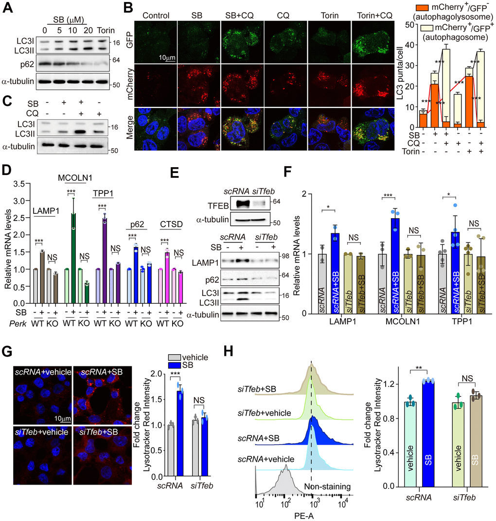 Coordination of the multiple steps in the ALP requires TFEB as a master regulator [21]. The main function of TFEB was identified in coordinating autophagy through regulating autophagosome formation and autophagosome-lysosome fusion [27]. TFEB also promotes cellular clearance through lysosomal exocytosis, a process mediated by activation of the lysosomal Ca2+ channel MCOLN1 [35]. To investigate whether SB202190-induced TFEB activation enhances the activation of the autophagy-lysosomal axis, we first measured LC3B-II and p62 levels. Consistent with a previous study [29], SB202190 increased the levels of LC3B-II and decreased p62 expression in a dose-dependent manner (Figure 5A and Supplementary Figure 3A). To further investigate the effect of SB202190 on autophagy flux, we analyzed autophagosome (yellow puncta) and autolysosome (red puncta) in SH-SY5Y cells transfected with the mCherry-EGFP-LC3 reporter. Autolysosome levels were increased by SB202190 and were further enhanced following chloroquine (CQ) treatment (Figure 5B). Moreover, LC3B-II conversion in the presence of CQ was greater than that observed in SB202190-treated cells in the absence of chloroquine, suggesting that SB202190 treatment stimulates autophagic flux (Figure 5C). Next, we examined whether the effect of SB202190 on lysosomal biogenesis is dependent on PERK activation. We observed significant and dose-dependent increases in levels of lysosomal genes, including cathepsin D, cathepsin B, LAMP1, MCOLN1, and TPP1, in SB202190-treated SH-SY5Y cells (Supplementary Figure 3B, 3C). Consistent with the finding that TFEB activation in response to SB202190 treatment is dependent on PERK (Figure 3), we observed that the expression levels of ALP-related genes were increased by SB202190 treatment in Perk+/+ cells, but not in Perk-/- cells (Figure 5D and Supplementary Figure 3D). In contrast, the ability of SB202190 to increase the mRNA expression of lysosomal genes was not affected by genetic deficiency of IRE1α and ATF6α (Supplementary Figure 3E, 3F). In addition, deficiency of TFEB clearly suppressed SB202190-increased levels of LAMP1, p62 and LC3B-II (Figure 5E, 5F and Supplementary Figure 3G). We also showed that the SB202190-dependent increase in lysosomal biogenesis required TFEB, using LysoTracker staining (Figure 5G, 5H). Overall, these results revealed that PERK activation by SB202190 regulates the ALP through TFEB activation.