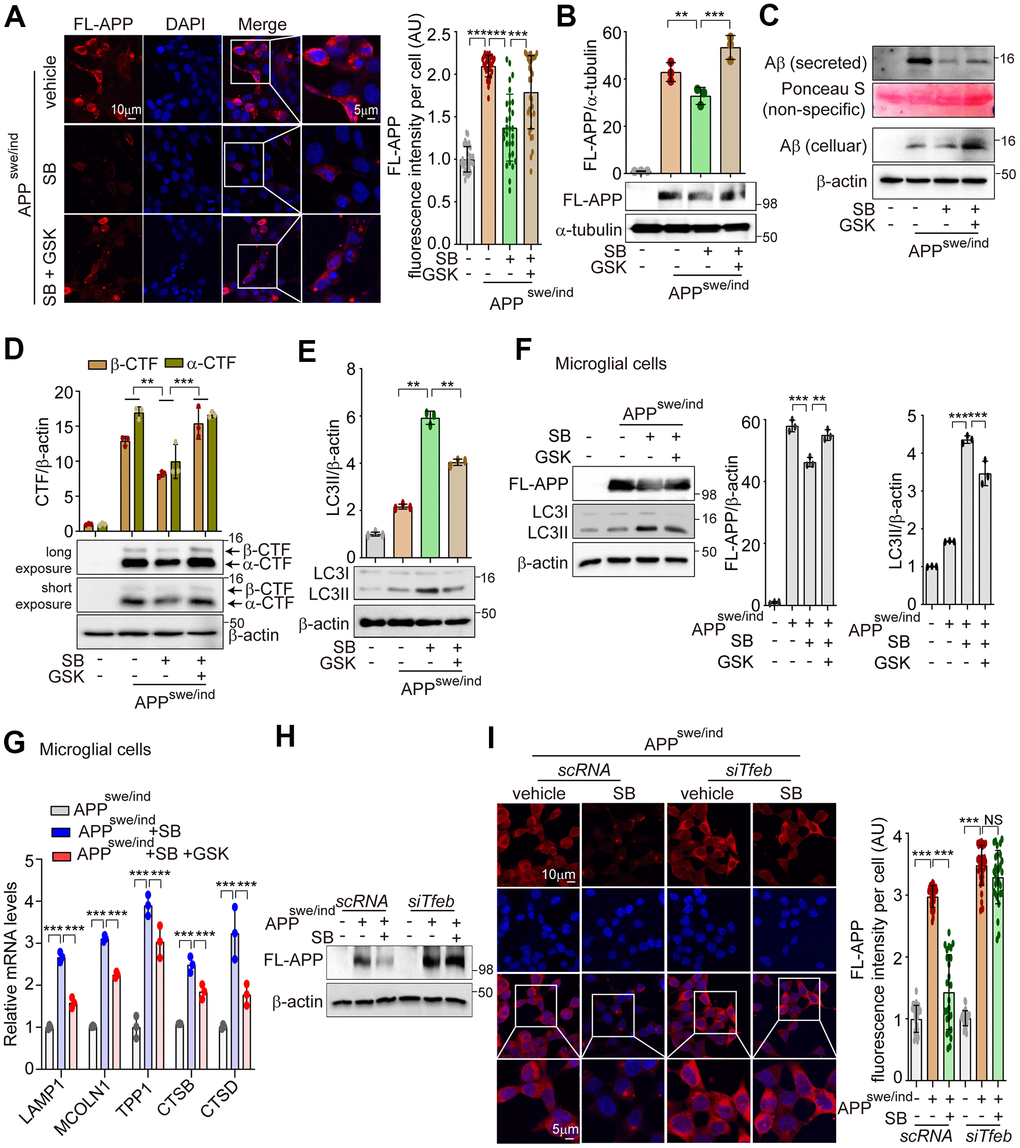 PERK activation enhances the ALP via TFEB activation to degrade misfolded proteins that accumulate in neurodegenerative disorders [36, 37]. A PERK activator was shown to act as a potent agent that reduces toxicity and extends survival in murine models of HD [37]. Accumulations of APP and α-syn have been observed in AD and PD, respectively [21]. To explore whether SB202190-induced PERK activation attenuates amyloidogenesis, SH-SY5Y cells were transfected with plasmids encoding APP 695 Swedish and Indiana mutation (APPSwe/Ind) for inducing the increase of full length-APP (FL-APP), or α-synuclein A53T mutation (α-Syn-A53T) for inducing α-syn aggregation. The aggregated proteins of FL-APP or α-syn were increased by SB202190 treatment and conversely were inhibited by the PERK inhibitor, GSK2606414 (Figure 6A and Supplementary Figure 4A). In addition, SB202190 inhibited the increase of FL-APP, secreted Aβ and CTFα/β in APPSwe/Ind transfected cells, which were reversed by GSK2606414 in SH-SY5Y cells (Figure 6B–6D). Consistent with the function of SB202190 in the degradation of neurotoxic proteins, LC3B-II conversion was increased after SB202190 treatment but not in the presence of the PERK inhibitor (Figure 6E and Supplementary Figure 4B), suggesting that autophagy processing may mediate the SB202190-induced decrease of APP and α-syn. In APPSwe/Ind transfected human microglial cells, we also confirmed that the inhibition of FL-APP increase by SB202190 was recovered by GSK2606414; and that the SB202190-induced increase in LC3B-II levels was inhibited by GSK2606414 (Figure 6F). In addition, lysosomal genes increased by SB202190 were suppressed after GSK2606414 (Figure 6G). In Figure 2, we demonstrated that PERK activation by SB202910 treatment in SH-SY5Y cells was mediated by mtROS production. Thus, to confirm the role of mtROS in the degradation of aggregated mutant amyloid protein, APPSwe/Ind transfected SH-SY5Y cells were treated with MitoTEMPO. As expected, the decrease of mutant APP accumulation was reversed by MitoTEMPO treatment (Supplementary Figure 4C). As shown in Figure 5, ALP activation by SB202190 in SH-SY5Y cells was dependent on TFEB activity. Therefore, to further investigate whether the effect of SB202190 on degradation of accumulated mutant APP was dependent on TFEB, we performed co-transfection of SH-SY5Y cells with siTfeb and APPSwe/Ind. TFEB deficient cells failed to degrade FL-APP after SB202190 treatment, indicating that TFEB activation by SB202190 is essential to activate ALP for the reduction of neurotoxic proteins in SH-SY5Y cells (Figure 6H, 6I). Taken together, our results demonstrate that SB202190-induced ALP activation which is responsible for degradation of mutant APP and α-syn accumulation requires PERK-dependent TFEB activation.