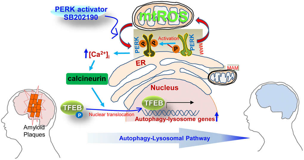 In summary, our data reveal a novel cytoprotective role for SB202190 as a PERK activator in human neuroblastoma cells. Our findings also suggest that SB202190 activates PERK via an increase of mtROS, leading to calcineurin activation. Subsequently, PERK activation by SB202190 leads to an increase in TFEB nuclear translocation through calcineurin-dependent dephosphorylation of TFEB. Finally, SB202190-PERK-TFEB activation attenuates amyloidogenesis via the increase of the ALP (see schema in Figure 7). We anticipate that SB202190 and related compounds targeting PERK can be developed as therapeutics to ameliorate amyloidogenesis in neurodegenerative disorders.