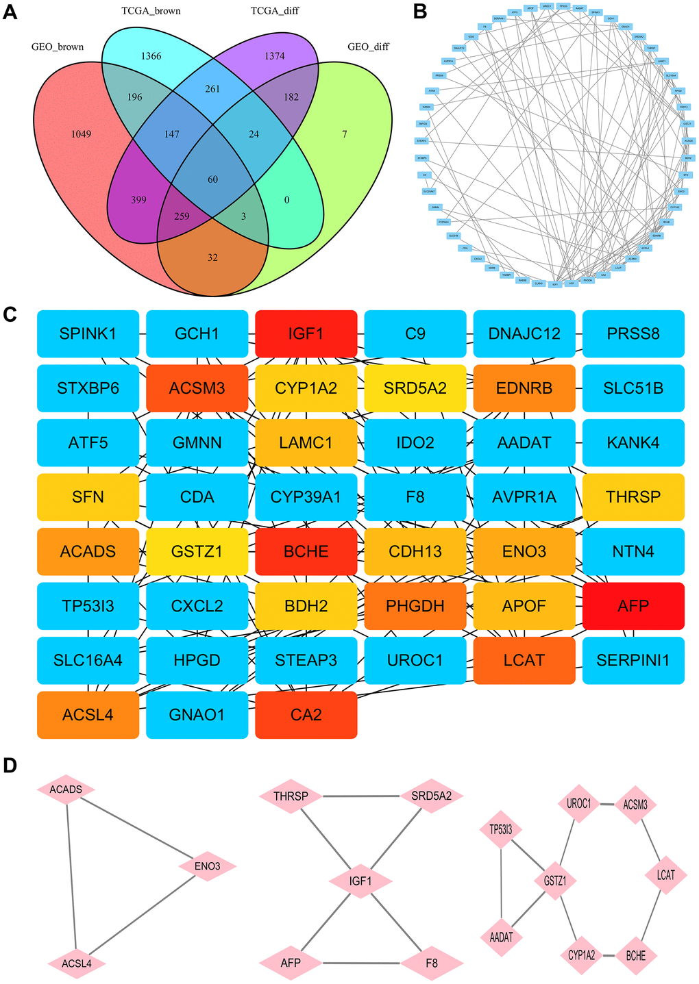 After normalization of the microarrays, 2705 differentially expressed genes (DEGs) between the HCC and normal tissues from the TCGA dataset (TCGA_diff) and 567 DEGs from the GEO datasets (GEO_diff) were screened by the “limma” package in R. Then, a Venn diagram was performed to examine the intersection among the DEGs and co-expressed genes of key modules. As shown in Figure 2A, 60 differentially co-expressed genes were finally obtained.