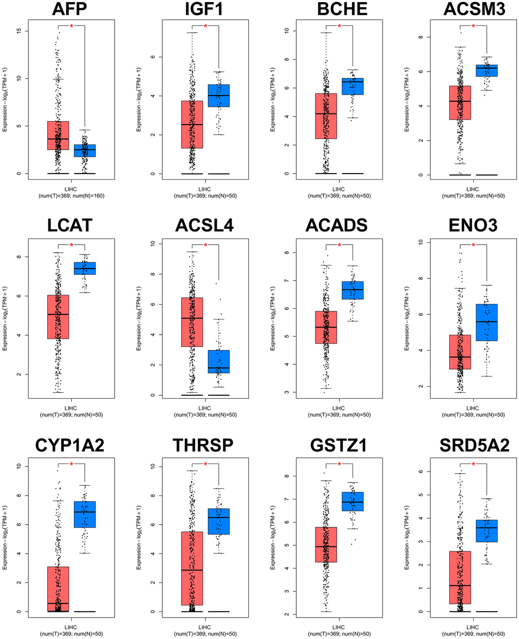 The PPI network of the 60 differentially co-expressed genes was constructed in the STRING database (Figure 2B). As showed in Figure 2C, the core genes were extracted from the PPI network by the MCC algorithms via the CytoHubba plug-in. Meanwhile, the significant modules of the 60 differential co-expression genes were established using the MCODE plug-in in Cytoscape (Figure 2D). Combining the above two algorithms, AFP, IGF1, BCHE, ACSM3, LCAT, ACSL4, ACADS, ENO3, CYP1A2, THRSP, GSTZ1, and SRD5A2 were finally selected as hub genes. Among them, AFP and ACSL4 were up-regulated and the other 10 hub genes were down-regulated in HCC tissues (Figure 3). To evaluate the prognostic values of the hub genes in HCC patients, a 5-year survival analysis was performed by Kaplan-Meier plotter. As shown in Figure 4, higher expression of LCAT, ACSM3, IGF1, SRD5A2, THRSP, and ACADS was associated with a better 5-year overall survival (p<0.05).
