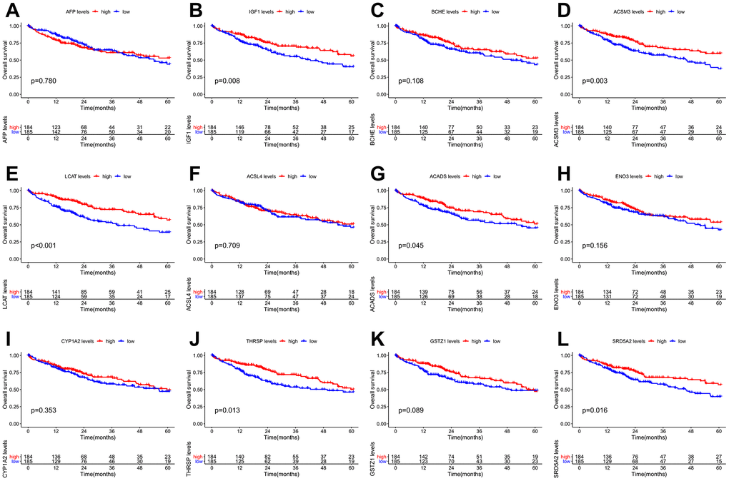 For the other hub genes related to the prognosis of HCC, LCAT (Lecithin-cholesterol acyltransferase) is a plasma enzyme involved in reverse cholesterol transport (RCT) and high-density lipoprotein (HDL) metabolism and has been reported to play an important role in many other cancers, such as breast cancer [15], Hodgkin lymphoma [16], and ovarian cancer [17]. The previous studies had reported the significantly low expression and high DNA methylation of LCAT in HCC patients [18–20]. Besides, LCAT plays a crucial role in the conversion of liver cirrhosis into HCC [21]. ACSM3, as one member of the acyl-CoA synthetase medium-chain family, was found to be frequently down-regulated in HCC patients exhibiting high AFP levels, high ALT levels, large tumors, and multiple nodules. On the contrary, higher ACSM3 expression was always associated with a better prognosis and may hinder metastasis of HCC by downregulating phosphorylation of WNK1 and AKT [22]. IGF-1 (growth factor-1) has been widely reported that its expression decreased sharply in patients with chronic liver disease such as steatosis, nonalcoholic steatohepatitis, chronic hepatitis C, cirrhosis, and HCC [23–29]. The reason may be that most of the circulating levels of IGF-1 were synthesized by the liver [30, 31]. IGF1 synthesis decreases when hepatitis or liver necrosis occurs. In addition, a prospective cohort study demonstrated that IGF-1 can be an independent predictor of survival or recurrence in early HCC [32]. IGF1 was also demonstrated to play an important role in the cellular function aspects of hepatocarcinogenesis and could be a therapeutic target against HCC [33–35]. For instance, Sorafenib could inhibit macrophage-induced growth of hepatoma cells by disrupting IGF1 secretion [34]. SRD5A2, also known as steroid 5-alpha-reductase 2, encodes a microsomal protein. As a membrane-associated enzyme, it catalyzes the transformation of testosterone to dihydrotestosterone (DHT). SRD5A2 is highly expressed in androgen-sensitive tissues such as the prostate and the expression of SRD5A2 is associated with the progression of prostate cancer [36–39]. To date, some reports revealed that SRD5A2 polymorphism may be associated with liver cancer, and it might serve as a robust diagnosis or prognosis marker for the diagnosis of HCC [40–42]. ACADS, namely acyl-CoA dehydrogenase short-chain, encodes a tetrameric mitochondrial flavoprotein and catalyzes the initial step of the mitochondrial fatty acid beta-oxidation pathway. It was identified as a potential biomarker in colon adenocarcinoma and bladder cancer [43, 44]. A previous study demonstrated that ACADS was significantly down-regulated in HCC tissues and was regulated by DNA methylation, which played a key role in promoting the proliferation and metastasis of HCC [45].