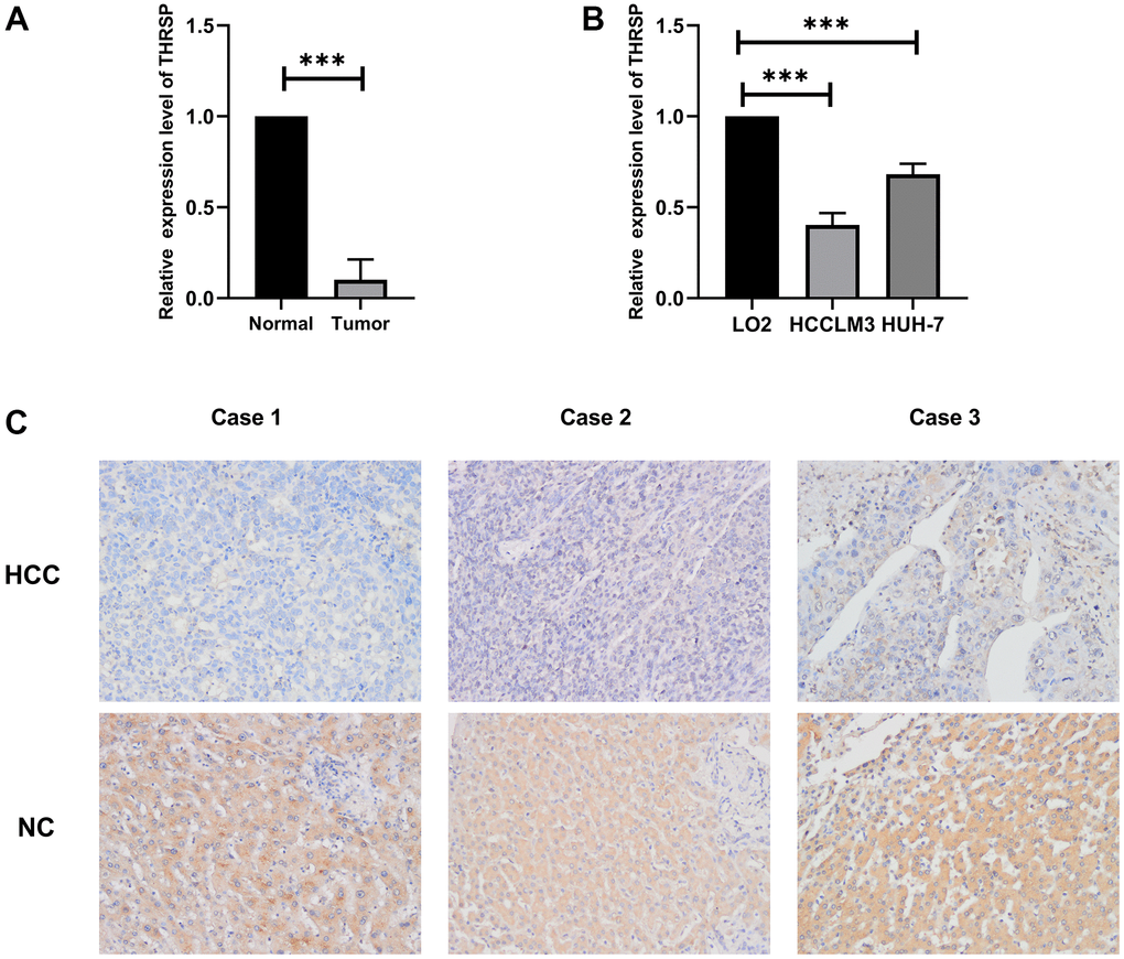 10 pairs of HCC tissues and paracancerous tissues were fixed in formalin, dehydrated, and embedded in paraffin. The paraffin sections were deparaffinized for antigen retrieval and treated with 3% hydrogen peroxide for blocking peroxidase activity, with 3% bovine serum albumin (BSA) for serum sealing. Afterward, the paraffin sections were incubated with primary THRSP antibody (Guangzhou Alexan Biotech Co., Ltd., China) overnight at 4° C, and then with HRP-conjugated secondary antibody for 50 min at room temperature. 3,3′-Diaminobenzidine (DAB) liquid substrate was used for staining and the hematoxylin solution was used for nucleus counterstaining. Finally, after dehydration and mounting, a microscope was used to acquire images of the staining of tissues.
