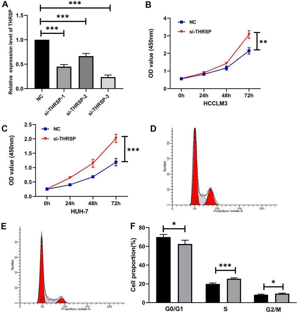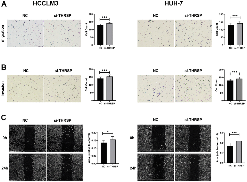To explore the functional roles of THRSP in HCC, three candidate siRNAs of THRSP (THRSP-siRNAs) were transfected into HCCLM3 and Huh-7 cells. qRT-PCR was performed to evaluate the inhibition efficiency of the three THRSP-siRNAs. Three THRSP-siRNAs significantly inhibited THRSP expression compared with the negative control (Figure 6A). The si-THRSP-3 was selected for the following experiments due to its robust silencing efficiency. The CCK-8 assays indicated that silencing of THRSP could promote proliferation of HCCLM3 and Huh7 cells (Figure 6B, 6C). The flow cytometry assays indicated that the si-THRSP group presented a significantly higher percentage of HCCLM3 cells in the S phase and the G2/M phase, but a lower percentage of cells in the G0/G1 phase compared with the control group (Figure 6D–6F). Transwell and wound scratch assays indicated that silencing of THRSP also promoted migration and invasion of HCC cells (Figure 7A–7C).