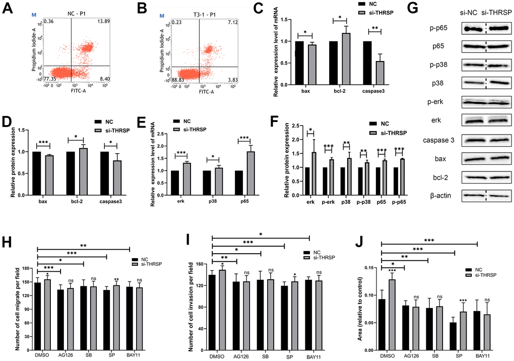 In this study, cells were strained with Annexin V/PI and subjected to flow cytometry to determine the apoptotic cells. The results indicated that silencing of THRSP could inhibit HCC cell apoptosis (Figure 8A, 8B). qRT-PCR and Western blotting assays were performed to detect the cell apoptosis-related molecules, including bax, bcl-2 and caspase 3. The results indicated that silencing of THRSP significantly reduced the expression of bax and caspase 3, while enhanced the expression of bcl-2 (Figure 8C, 8D).