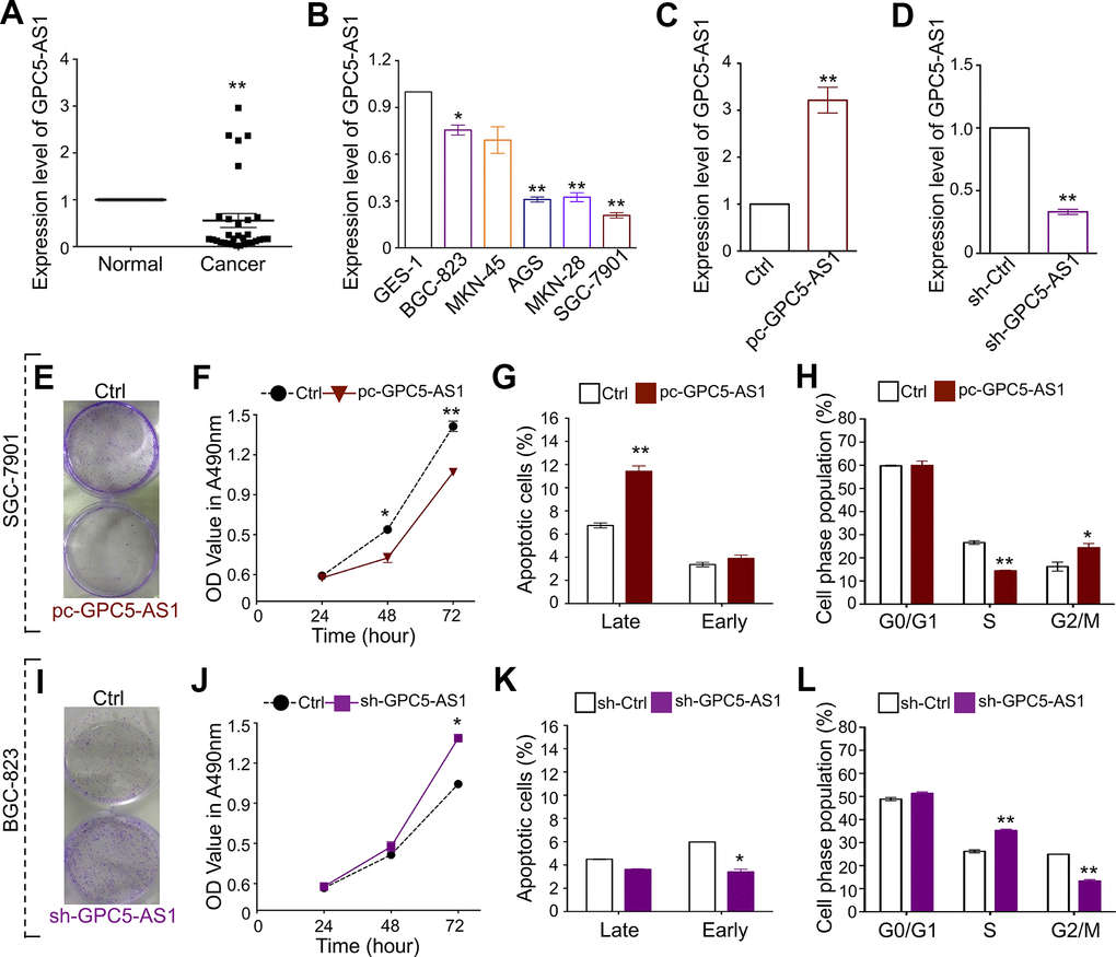 Based on the GPC5-AS1 expression in GC cell lines, gain-of-function and loss-of-function studies have been performed to determine the role of GPC5-AS1 in SGC-7901 and BGC-823 cells, respectively. The qRT-PCR analysis demonstrated satisfactory overexpression or downregulation of GPC5-AS1 using a GPC5-AS1 expression plasmid or short hairpin RNA (shRNA) targeting GPC5-AS1, respectively (Figure 1C, 1D). Subsequently, MTT and colony forming assays, cell cycle analyses, and cell apoptosis analyses were performed. The results showed that the enforced expression of GPC5-AS1 led to a reduction in colony formation (Figure 1E) and cell growth at both 48 and 74 h post transfection (Figure 1F), high apoptotic rates in the late phase (Figure 1G), marker accumulation in the G2-phase, and a decrease in S-phase population of SGC-7901 cells (Figure 1H). Furthermore, silencing GPC5-AS1 with shRNA showed that a reduction in GPC5-AS1 could contribute to the tumorigenicity of BGC-823 cells. Transfection with sh-GPC5-AS1 promoted colony formation (Figure 1I), induced cell growth (Figure 1J), moderately affected cell apoptosis (Figure 1K), and blocked S-G2 transition (Figure 1L). The results suggest the contribution of endogenous GPC5-AS1 in the inhibition of GC progression.