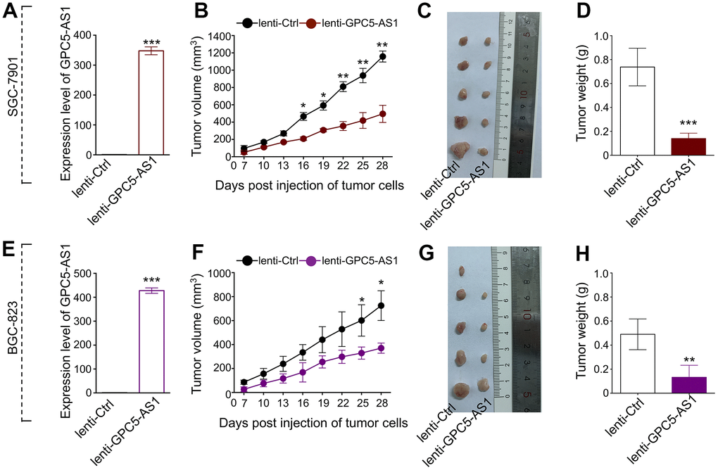 To predict the biological function of GPC5-AS1 in GC progression, we explored the proliferative potential of GPC5-AS1 using an in vivo tumor xenograft model. The GPC5-AS1 level in SGC-7901 or BGC-823 cells transfected with lenti-GPC5-AS1 was assessed using qRT-PCR to ensure stable overexpression in comparison with that in lenti-ctrl-transfected cells (Figure 2A, 2E). The cells were then injected into each side of the flank of nude mice, and tumor size was monitored every 3 days for 4 weeks. Growth curves demonstrated that GPC5-AS1 significantly reduced tumor growth in mice, regardless of the cancer cell line (Figure 2B, 2F). At the end of the in vivo experiment, all mice were humanely euthanized for tumor excision and weighing (Figure 2C, 2G). On an average, the mass of SGC-7901 cells that formed tumors in the lenti-GPC5-AS1 transfected SGC-7901 treatment group was only 19.0 % of the total tumor weight in the control (Figure 2D), whereas the mass of BGC-823 cells that formed tumors in the lenti-GPC5-AS1 transfected BGC-823 treatment group was approximately 27.1 % of the total tumor weight in the control (Figure 2H). These data indicate that GPC5-AS1 could remarkably inhibit the tumorigenicity of GC cells in a nude mouse xenograft model.