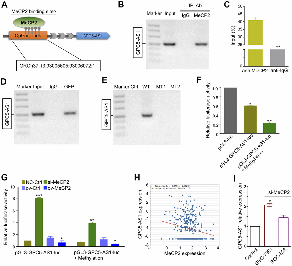 GPC5-AS1 was first identified by chromatin immunoprecipitation sequencing (ChIP-Seq) in our previous study [19]. It contains a CpG site within the promoter regions that may interact with MeCP2 (Figure 3A). ChIP-RT-PCR confirmed that MeCP2 could directly bind to the promoters of GPC5-AS1 in SGC-7901 cells (Figure 3B, 3C). After transfecting SGC-7901 cells with WT or MT GFP-MeCP2 plasmids, we used ChIP-RT-PCR with an anti-GFP antibody and found that exogenous MeCP2 could bind with the CpG sites on GPC5-AS1 promoter regions (Figure 3D). In addition, although GFP-WT also bound to the CpG sites of GPC5-AS1, GFP plasmid (Ctrl) or GFP-MT (1 and 2) did not (Figure 3E). Subsequently, promoter reporter assay was performed to determine whether MeCP2 binds with the CpG sites on the GPC5-AS1 promoter. The sequence of binding sites from previous ChIP-Seq data was inserted into the upstream of luciferase gene in the pGL3 reporter vector. The luciferase signals of SGC-7901 cells was detected at 48 h after transfection, and the results indicated that the luciferase activity of both pGL3-GPC5-AS1-luc and pGL3-GPC5-AS1-luc+methylation groups were considerably reduced compared with that of the pGL3 group (Figure 3F). After transfection with pGL3-GPC5-AS1-luc, the luciferase activity of the MeCP2 siRNA group was increased compare with that of the NC siRNA group, whereas the luciferase activity of the MeCP2 overexpression group was reduced compared with that of the control. Transfection with the pGL3-GPC5-AS1-luc+methylation vector provided similar results, and the luciferase activity of the GPC5-AS1-luc+methylation group was reduced compared with that of the pGL3-GPC5-AS1-luc group (Figure 3G). These data confirm that MeCP2 is a critical regulator of GPC5-AS1 expression in GC cells. To further verify this finding, we examined GPC5-AS1 expression in TCGA database. The mRNA expression of MeCP2 was significantly positively correlated with GPC5-AS1 expression in human GC tissues (Figure 3H), and GPC5-AS1 expression was upregulated after silencing MeCP2 with si-MeCP2, especially in SGC-7901 cells (Figure 3I).