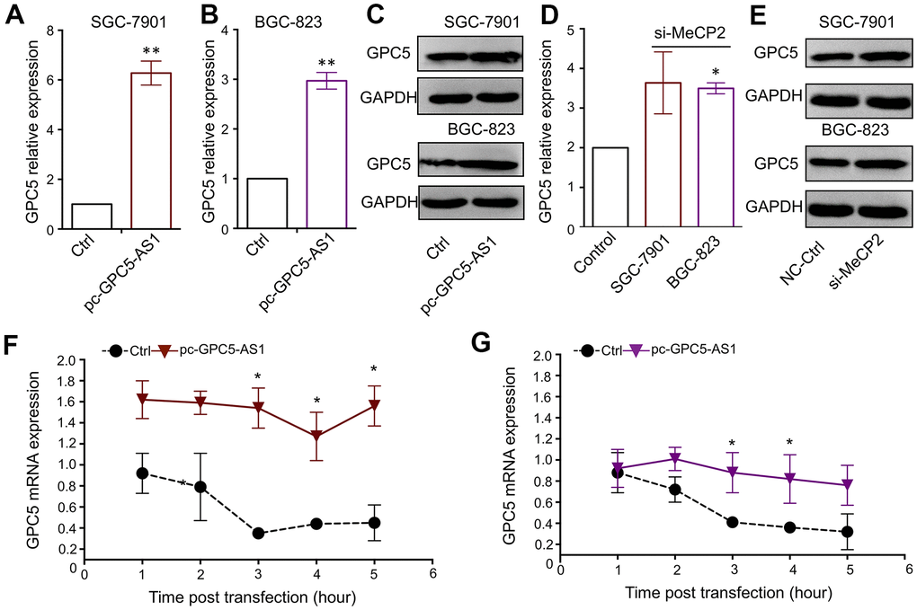 Both GPC5-AS1 and GPC5 were found to be downregulated in GC cells and suppress GC progression. The qRT-PCR and western blotting analyses confirmed the remarkable positive regulation of GPC5 expression after GPC5-AS1 acceleration (Figure 5A–5C). Moreover, the silencing of MeCP2 also resulted in a slight increase in GPC5 expression in BGC-823 and SGC-7901 cells (Figure 5D, 5E). LncRNA have been reported to mediate target gene expression by stabilizing the transcripts, and our results showed that following treatment with actinomycin D, GPC5-AS1 overexpression led to a deferred degradation of GPC5 mRNA (Figure 5F, 5G).