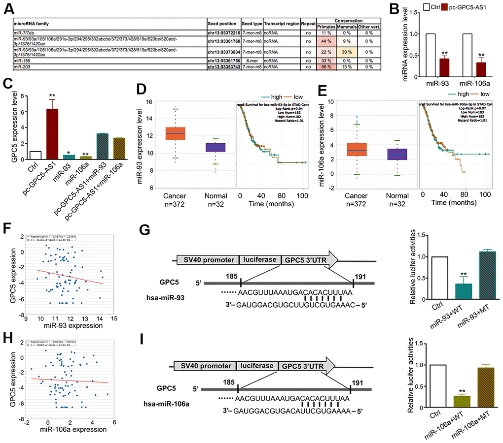 Studies have demonstrated that lncRNAs can function as ceRNAs by binding with several miRNAs and regulate their target gene expression. To clarify whether GPC5-AS1 regulates GC progression as a ceRNA, we utilized the bioinformatics database miRcode to predict the top negatively correlated miRNAs (miR-93 and miR-106a), which were also predicted to directly target the GPC5 3′-UTR region (Figure 6A). Furthermore, qRT-PCR was performed to investigate the inverse correlation of miR-93 and miR-106a with GPC5-AS1 in SGC-7901 cells (Figure 6B). Subsequently, we measured the expression of GPC5 after transfecting with miR-93 or miR-106a mimics in the presence or absence of pc-GPC5-AS1, and found that GPC5-AS1 overexpression could fully rescue miR-93 and miR-106a induced GPC5 mRNA inhibition (Figure 6C). TCGA database revealed that miR-93a and miR-106 were downregulated (Figure 6D, 6E) and negatively correlated with GPC5 in GC samples (Figure 6F, 6H). As miRbase predicted, miR-93 and miR-106a may bind to the 185–191 bp site in the 3′-UTR of GPC5. To verify this prediction, we used a dual-luciferase reporter assay in HEK-293 cells. miR-93 or miR-106a mimics reduced the luciferase signals of GPC5-WT cells significantly, and had no effect on the luciferase activity of GPC5-MT (Figure 6G, 6I). Considering these findings, GPC5-AS1 appears to be acting as a molecular sponge for miR-93 and miR-106a in GC.