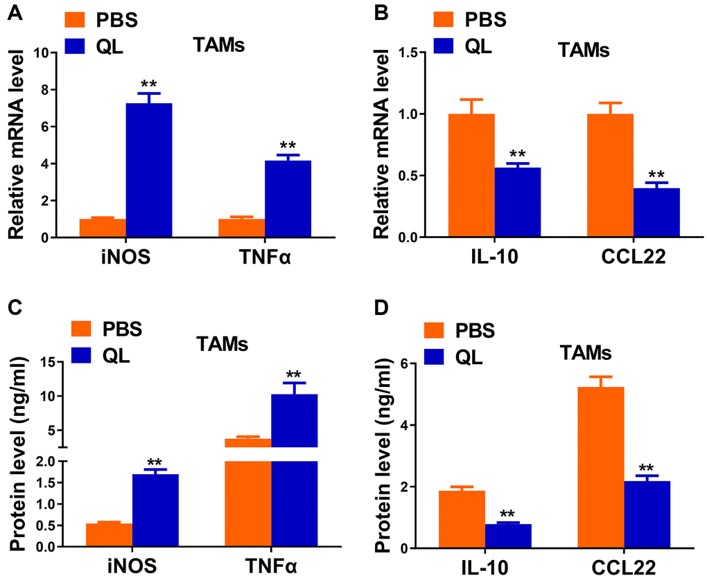 We continued to evaluate the effects of QL serum on phenotypes of TAMs by measuring the expression of typical M1and M2 markers. QL serum-treated TAMs had significantly increased mRNA expression of iNOS and TNF-α, two M1 markers (Figure 2A). In contrast, the mRNA level of M2 markers IL-10 and CCL22 was significantly decreased in QL serum-treated TAMs (Figure 2B). Correspondingly, significantly increased protein levels of iNOS and TNF-α (Figure 2C), and significantly decreased protein levels of IL-10 and CCL22 (Figure 2D) were detected in TAMs treated with QL serum. Collectively, these results indicated that QL serum converted the M2 phenotype of TAMs to M1 phenotype.