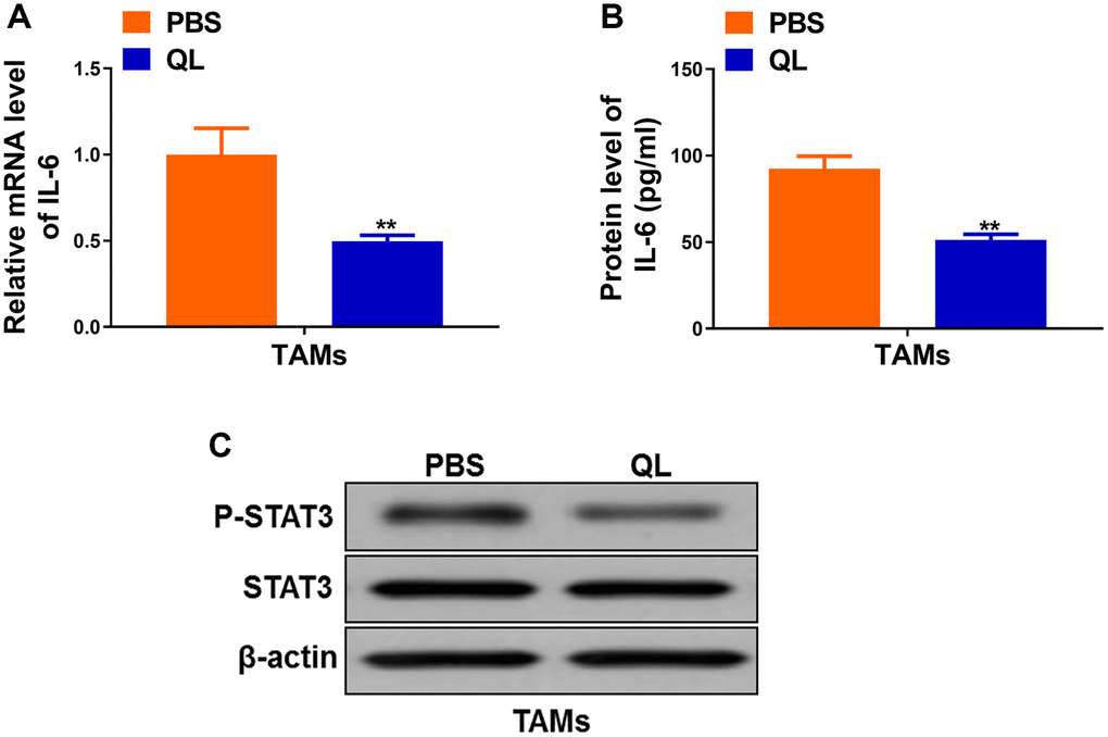 IL-6/STAT3 signaling pathway has been shown to regulate TAMs polarization in tumor [11, 12]. Therefore, we continued to evaluate the effects of QL serum on IL-6/STAT3 signaling pathway in TAMs. We detected significantly decreased mRNA level (Figure 3A) as well as protein level (Figure 3B) of IL-6 in QL serum-treated TAMs when compared to PBS-treated TAMs. We also detected markedly decreased phosphorylation of STAT3 in QL serum-treated TAMs (Figure 3C). These results demonstrated that QL serum inhibited IL-6/STAT3 signaling pathways in TAMs.