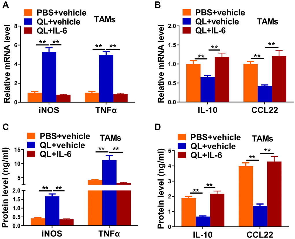 As QL serum targeted IL-6 and promoted the M1 phenotype of TAMs, we wanted to determine whether administration of IL-6 would affect QL serum’s effects. We administrated IL-6 together with QL serum to TAMs and measured the expression of M1, M2 markers. QL serum treatment significantly increased the mRNA expression of M1 makers iNOS and TNF-α, while the upregulation was abolished in the presence of IL-6 (Figure 4A). In contrast, QL serum treatment significantly downregulated the mRNA level of M2 markers IL-10 and CCL22 while IL-6 rescued the mRNA expression of IL-10 and CCL22 in QL serum-treated TAMs (Figure 4B). Correspondingly, IL-6 significantly decreased protein levels of iNOS and TNF-α (Figure 4C), while significantly increased protein levels IL-10 and CCL22 (Figure 4D) in QL-treated TAMs.