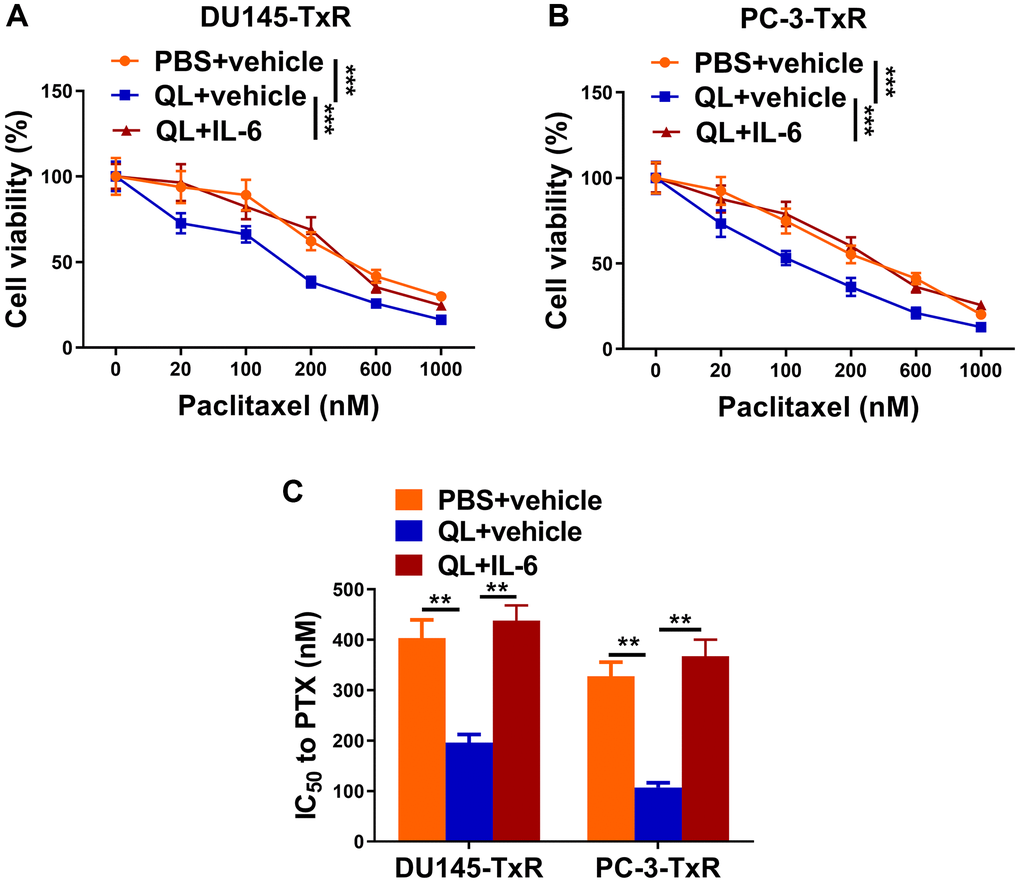 Finally, we evaluated the effects of IL-6 and QL serum on sensitivity of paclitaxel-resistant prostate cancer cells to paclitaxel. We treated TAMs with QL serum or QL serum together with IL-6 (QL+IL-6), and measured the viability of co-cultured DU145-TxR or PC-3-TxR cell which were treated with different concentrations of paclitaxel. As shown in Figure 5A, the DU145-TxR cells co-cultured with QL serum-treated TAMs had significantly decreased viability compared to DU145-TxR cells co-cultured with PBS serum-treated TAMs, when treated with same concentration of paclitaxel, indicating QL-treated TAMs decreased paclitaxel-resistance in DU145-TxR. In contrast, the DU145-TxR cells co-cultured with QL serum/IL-6-treated TAMs had significantly increased viability compared to DU145-TxR cells co-cultured with QL-treated TAMs, indicating IL-6 abolished the effects of QL serum on paclitaxel resistance in DU145-TxR (Figure 5B). Correspondingly, QL serum treatment resulted in significantly reduced IC50 of both DU145-TxR and PC-3-TxR to paclitaxel while IL-6 resensitized the paclitaxel resistance (Figure 5C). Collectively, these results showed that QL serum resensitized paclitaxel-resistant prostate cancer cells to paclitaxel via IL-6/STAT3 signaling in TAMs.