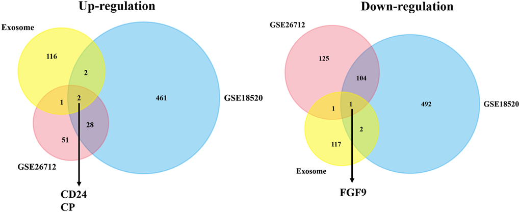 Through the exploration in GEO database, we finally picked out two suitable datasets and then attained the statistics of the two datasets. The cut-off value was set up: p-value <0.05 and |logFC| ≥2.0. After this procedure, DEGs between ovarian cancer group and normal group were generated. And we found that in GSE26712, there were 82 genes up-regulated and 231 genes down-regulated. Meanwhile, there were 493 up-regulated genes and 599 down-regulated genes in GSE18520 (Supplementary Table 1). Besides, we applied the Venn plot (http://bioinformatics.psb.ugent.be/webtools/Venn/) to implicate the significance of exosome-correlated genes in the development of OC patients. And the Venn plot showed that two upregulated exosome-correlated genes (CD24 and CP) and one downregulated exosome-correlated gene (FGF9) might play pivotal roles in OC progression (Figure 1).