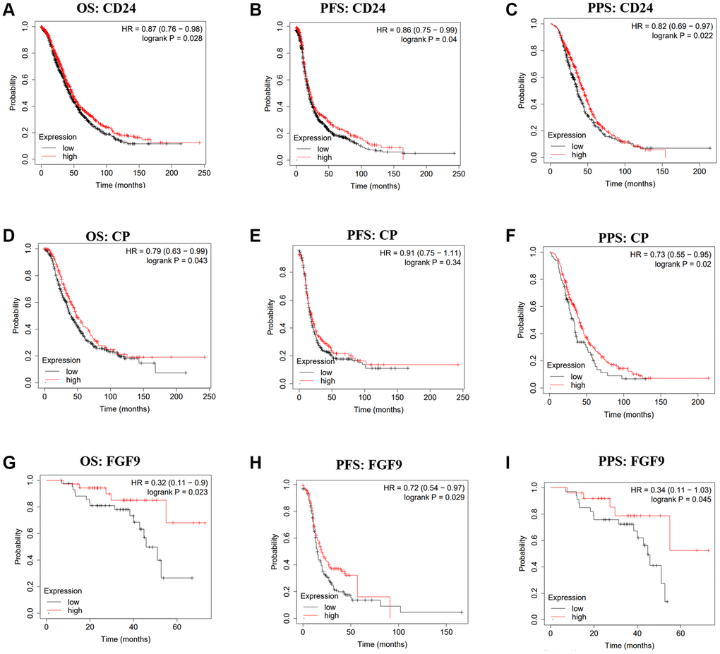 To investigate the correlation between the expression of CD24, CP, FGF9 and the OC patients’ prognosis, the Kaplan-Meier plotter was applied. The findings have conveyed that high expression level of CD24 was linked to good OS (HR = 0.87, 95% CI = 0.76–0.98, p = 0.028), PFS (HR = 0.86, 95% CI = 0.75–0.99, p = 0.04), PPS (HR = 0.82, 95% CI = 0.69–0.97, p = 0.022) (Figure 2A–2C). Furthermore, high expression of CP was related to favorable OS (HR = 0.79, 95% CI = 0.63–0.99, p = 0.043), PPS (HR = 0.73, 95% CI = 0.55–0.95, p = 0.02) (Figure 2D, 2F). However, CP expression was not correlated with the PFS of OC patients (p > 0.05) (Figure 2E). And from the GSE14764, we could conclude that higher expression of FGF9 was linked to the better prognosis of OS (HR = 0.32, 95% CI = 0.11–0.9, p = 0.023), PPS (HR = 0.34, 95% CI = 0.11–1.03, p = 0.045) (Figure 2G, 2I). Additionally, OC patients with high level of FGF9 showed favorable PFS (HR = 0.72, 95% CI = 0.54–0.97, p = 0.029) in GSE9891 (Figure 2H). From these results, we speculated that FGF9 could possess the potential ability to be a prognostic biomarker.