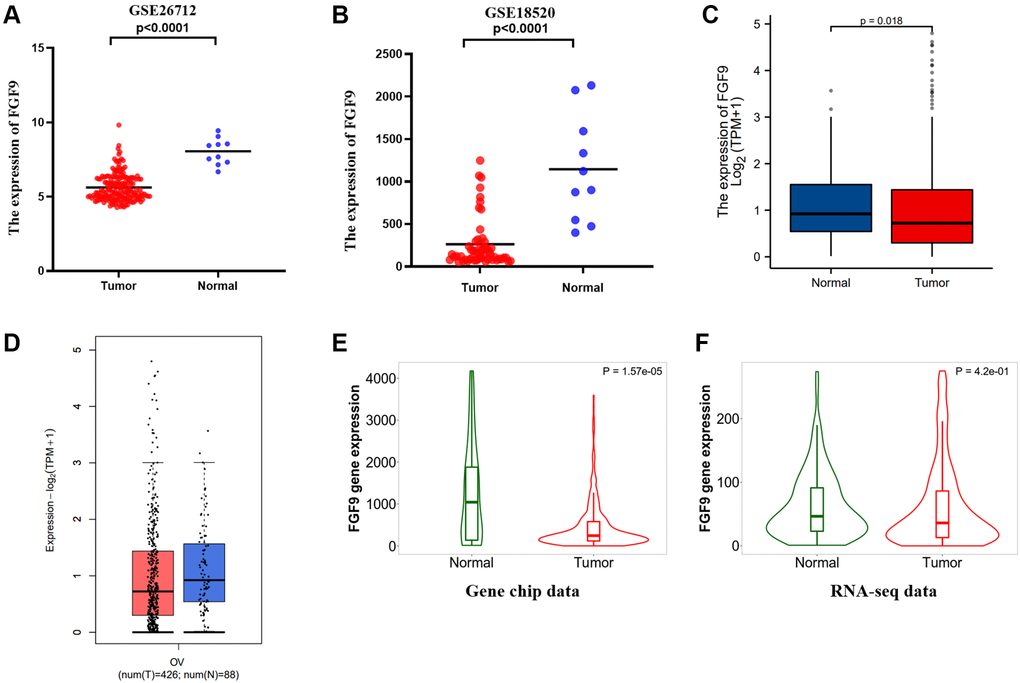 Through the evaluation of the two datasets downloaded from the GEO database, we found that FGF9 expressed more highly in normal ovarian tissues than ovarian cancer tissues (p < 0.0001) (Figure 3A, 3B). In addition, TCGA database has verified that the expression level of FGF9 was different between the normal group and the OC group (p = 0.018) (Figure 3C). Meanwhile, GEPIA2.0 platform has identified that the expression level of FGF9 was higher in the normal group than that in OC group (Figure 3D). What’s more, by means of the TNMplot platform, we could know about that FGF9 mRNA expression were both lower in OC tissues from gene chip data (p = 1.57e-05) and RNA-seq data (p = 4.2e-01) (Figure 3E, 3F). The above findings have conveyed that the expression of FGF9 quietly diminished in OC group, implicating that FGF9 might be a promising inhibitor in OC patients’ progression and development.