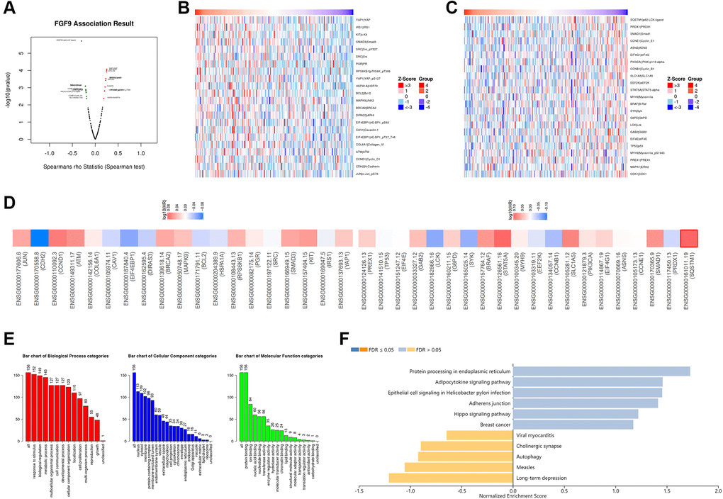 The LinkedOmics platform was applied to explore the co-expression network in the TCGAOV cohort, and then figuring out the biological functions of FGF9 in OC patients’ development. Figure 4A and Supplementary Table 2 have demonstrated the co-expressed genes that have positive and negative relationship with FGF9 (p < 0.05). Also, the heatmaps have depicted the genes that are positively and negatively correlated with FGF9 (Figure 4B, 4C and Supplementary Tables 3 and 4). Significantly, the top 19 positive-related genes have the great possibility to be low-risk molecules for OC patients. In addition, the top 20 negatively correlated genes that were high-risk molecules in OC. Meanwhile, 1 of top 20 negatively related genes owned the bad hazard ratio (Figure 4D). Moreover, through the investigation of Gene Ontology pathway, the result conveyed that the co-expressed genes of FGF9 participated in several biological process categories, such as response to stimulus, biological regulation and metabolic process. In the cellular component categories, these genes mainly take part in nucleus, cytosol and membrane. At the same time, the co-expressed genes of FGF9 significantly join in the protein binding, ion binding and nucleic acid binding in the molecular function categories (Figure 4E). Moreover, the KEGG analysis has implied that the enriched pathways were protein processing in endoplasmic reticulum, adipocytokine signaling pathway, epithelial cell signaling in helicobacter pylori infection, adherens junctions etc. (Figure 4F).