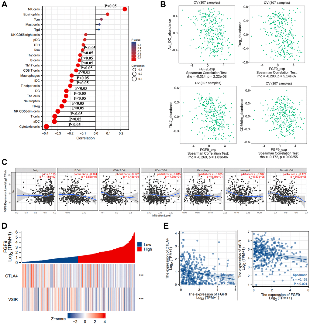 Then, we downloaded the statistics of TCGA-OV database and analyzed the effects of FGF9 expression on immune regulation of ovarian cancer patients via ssGSEA. It indicated that FGF9 was positively linked to the infiltration of natural killer (NK) cells (p < 0.05). Meanwhile, FGF9 expression was negatively correlated with cytotoxic cells, activated dendritic cells (aDC), T cells, NK CD56dim cells, Treg, neutrophils and T helper type 1 (Th1) cells (p < 0.05) (Figure 5A). In addition, the results that obtained from TISIDB database were consistent with the findings before (Figure 5B). By means of TIMER database, the plot further portrayed that the expression level of FGF9 had strong negative relationship with B cell, CD8+ T cell, CD4+ T cell, macrophage, neutrophil and dendritic cell (p < 0.05) (Figure 5C). Furthermore, the figures have depicted that the relationship between FGF9 expression and immune checkpoints and the findings showed that the expression level of FGF9 was negatively linked with CTLA4 (Spearman r = −0.239, p < 0.001) and VSIR (Spearman r = −0.169, – < 0.001) (Figure 5D, 5E).