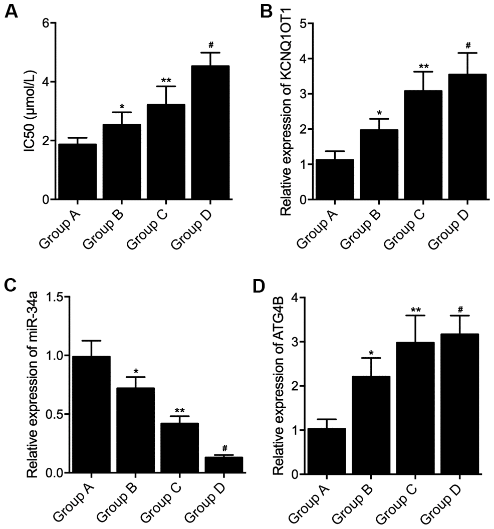 The characteristics of patients including gender, age, tumor size and tumor stage were compared among the four groups, no significant difference were found (Table 1). Ex vivo culture of the tumor tissue was performed followed by L-OHP treatment, IC50 was calculated for group A, B, C and D. The IC50 was gradually increased in Groups A, B, C and D (Figure 1A). KCNQ1OT1, miR-34a and ATG4B mRNA expression was examined in the tissue sample collected from patients in the four groups. The expression of KCNQ1OT1 (Figure 1B), as well as the expression of ATG4B mRNA (Figure 1D), was gradually elevated in Groups A, B, C and D (Figure 1B), while the expression of miR-34a was gradually decreased in Groups A, B, C and D (Figure 1C).