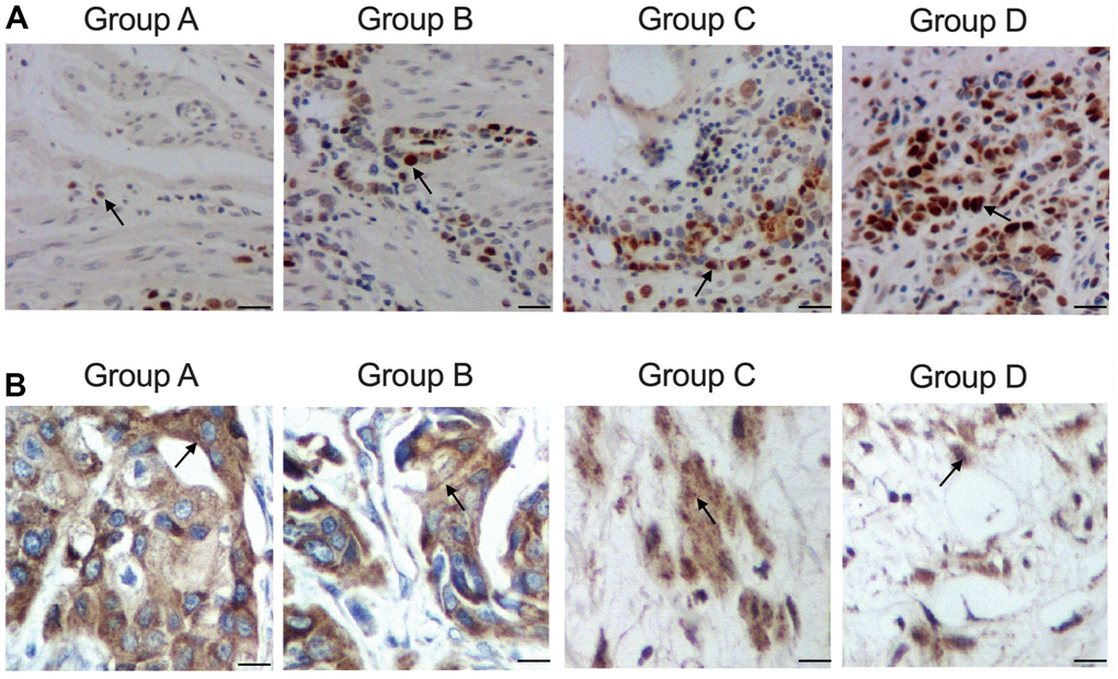Furthermore, according to the IHC results while measured the expression of ATG4B protein in the tissue sample collected from the patients, the expression of ATG4B protein was gradually elevated in Groups A, B, C and D (Figure 2A). And TUNEL results which analyzed the apoptosis of the tissue samples collected from the patients indicated that the apoptosis of the tissue samples was gradually decreased in Groups A, B, C and D (Figure 2B).