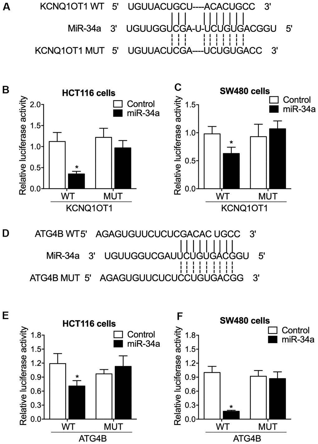 The luciferase activities of KCNQ1OT1 and ATG4B were suppressed by miR-34a