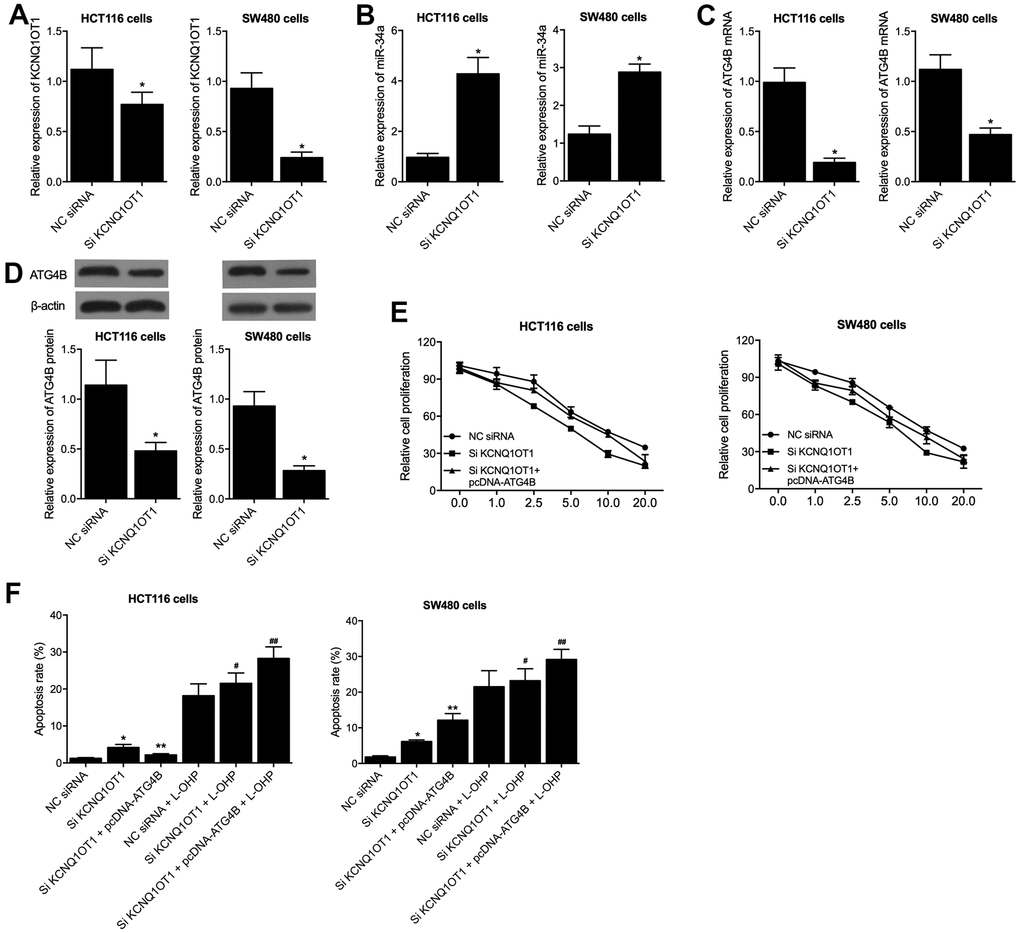 To gain an insight into the molecular mechanisms of KCNQ1OT1 on colon cancer, KCNQ1OT1 siRNA was transfected into HCT116 and SW480 cells, and the successful transfection of KCNQ1OT1 siRNA was validated by the remarkably suppressed expression of KCNQ1OT1 (Figure 4A). Meanwhile, the expression of miR-34a was remarkably enhanced by KCNQ1OT1 siRNA (Figure 4B), and the expression of ATG4B mRNA and protein was remarkably suppressed by KCNQ1OT1 siRNA (Figure 4C, 4D). Moreover, when co-transfecting pcDNA-ATG4B with KCNQ1OT1 siRNA into the HCT116 and SW480 cells, MTT assay results found that the reduced cell viability induced by knockdown of KCNQ1OT1 was restored by the transfection of pcDNA-ATG4B in HCT116 and SW480 cells (Figure 4E). Furthermore, KCNQ1OT1 siRNA and KCNQ1OT1 siRNA + pcDNA-ATG4B transfected HCT116 and SW480 cells were subjected to L-OHP treatment. Flow cytometry results showed that pcDNA-ATG4B effectively maintained the increased apoptosis rate induced by transfection of KCNQ1OT1 siRNA in HCT116 and SW480 cells. Besides, L-OHP treatments remarkably elevated the cell apoptosis rate of KCNQ1OT1 siRNA and KCNQ1OT1 siRNA + pcDNA-ATG4B cell groups of HCT116 and SW480 cells (Figure 4F).