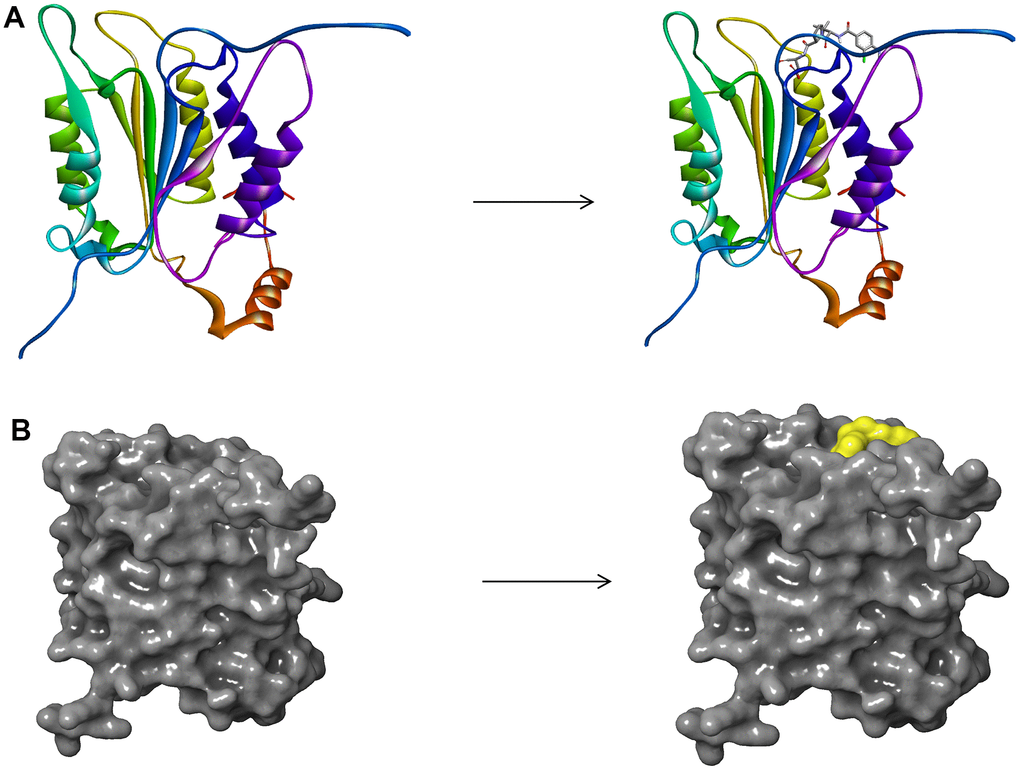Based on the Libdock module of DS 4.5, Caspase-1 and Belnacasan (VX-765) 's binding position served as a docking site to screen novel Caspase-1 inhibitors. Libdock was a rigid-based docking program, which employed polar and nonpolar probes and grids placed in binding sites to calculate hotspots of proteins. Afterward, the hot spots were used to arrange ligands to form well interactions. Then, Ligand minimization was carried out by Smart Minimiser algorithm and CHARMm forcefield (Cambridge, MA, USA). In the end, all the selected ligands were ranked based on the ligand score. The crystal structure of Caspase-1 in complex with Belnacasan (1.94 Å) was downloaded from protein data bank (PDB) and imported into DS 4.5 for Libdock. The 3D structures of Caspase-1 and the Belnacasan- Caspase-1 complex are displayed in Figure 1. Some procedures such as minimization of energy, hydrogenation, ionization, protonation, and removing crystal water and other heteroatoms were employed during protein preparation [32]. Besides, the energy minimization was also carried out by the Smart Minimiser algorithm and CHARMm forcefield.