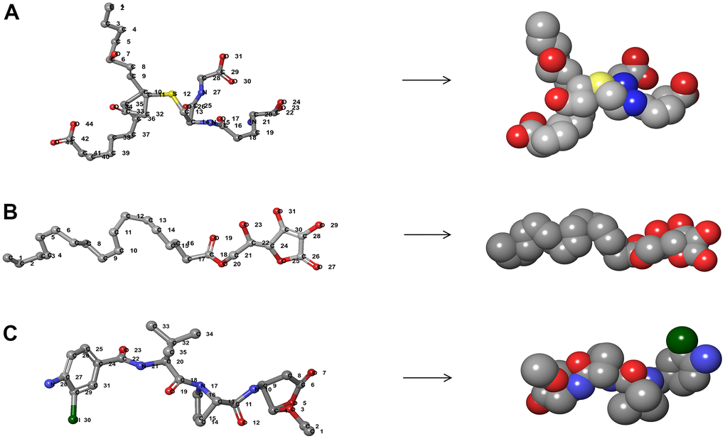 | Number | Compounds | Solubility Levela | BBB levelb | CYP2D6c | Hepatotoxicityd | Absorption Levele | PPB Levelf | ||||||||||||||||||||||||||||||||||||||||||||||||||||||||||||||||||||||||||||||||||||||||||||
