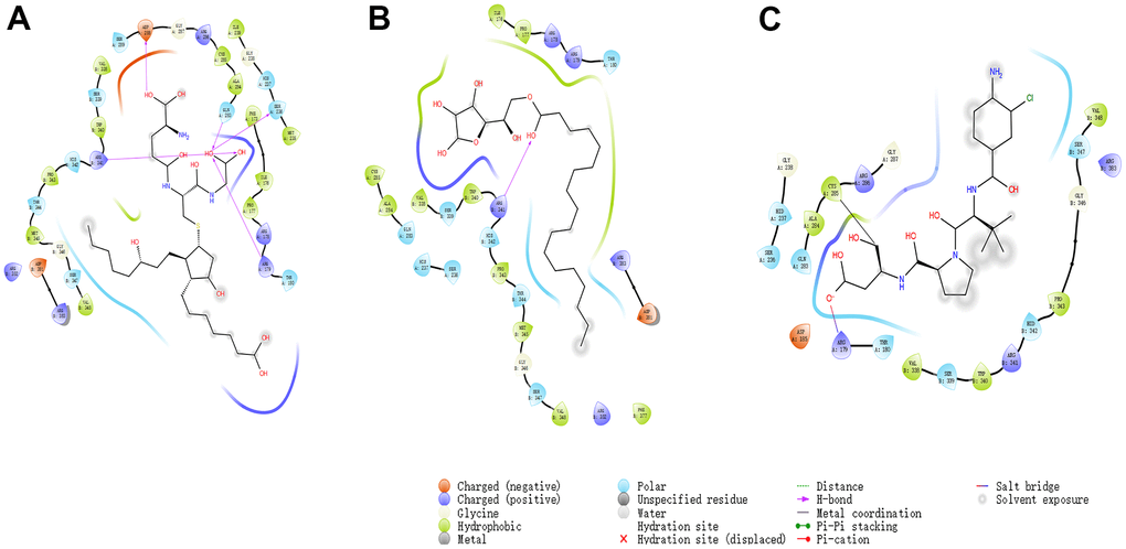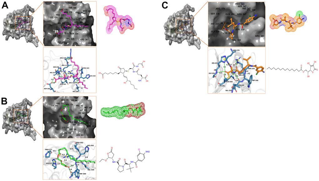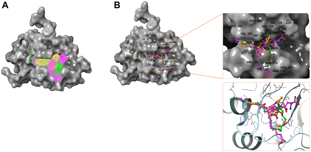 Besides, with the assistance of other docking software such as Schrodinger and PyMol software, we thoroughly analyzed the conformations of the ligands in the Caspase-1 binding pocket (Figures 3, 4) and the 2D and 3D structures of the interaction between the ligands and the Caspase-1’s amino acids residues (Figures 3, 5, 6). The combination of these two selected molecules with Caspase-1 in the binding pocket was visually and intuitively displayed. As shown in Figure 7, the selected two molecules had a significant overlap with Belnacasan in the posture of the binding pocket. In addition, these two control drugs had formed multiple Hydrogen bond interactions, Salt Bridges, and Hydrophobic bonds with Caspase-1. More importantly, ZINC000004099068 and Belnacasan formed bonds with the same amino acids in the protein binding pocket, including HIS237, ARG179, ARG341, GLN283. Similarly, ZINC000100634116 and Belnacasan formed bonds with identical amino acids residues in the protein binding pocket, including HIS237, ARG179, ARG341, TRP340. This showed that the two selected molecules and Belnacasan were primarily the same in their binding and interaction mode to Caspase-1, proving that they had similar inhibitory effects on Caspase-1. At the same time, we also found that HIS237, ARG179, and ARG341 amino acid residues play an essential role in the structural-functional domains of the protein binding pocket.