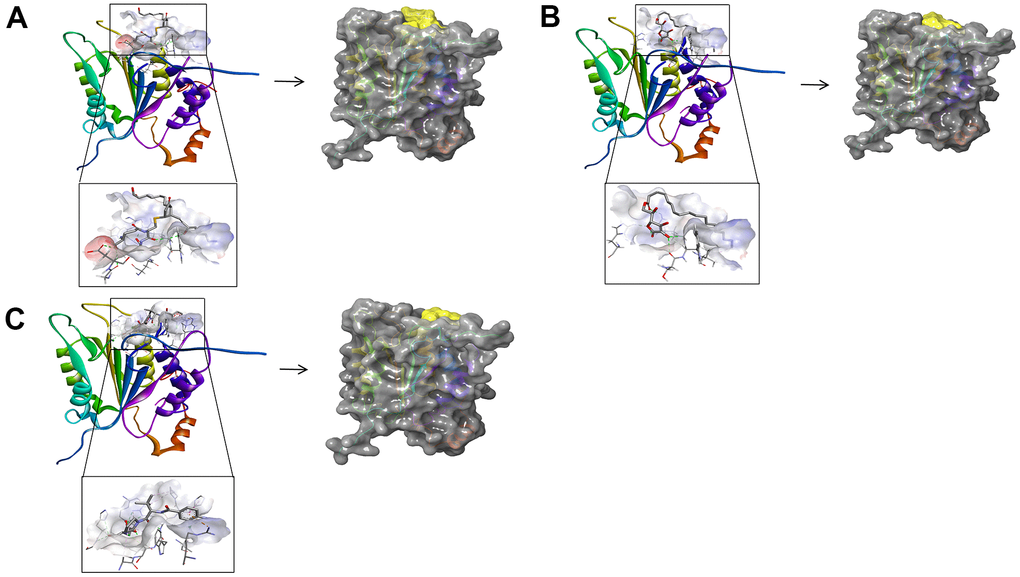 From the perspective of safety, we deeply examined different toxicity such as developmental toxicity potential (DTP), rodent carcinogenicity, and Ames mutagenicity (AMES) properties of compounds and Belnacasan using TOPKAT module of DS 4.5 (Table 3). The result indicated twelve compounds were non-mutagen. Five compounds were predicted to be non-carcinogens, and seven had no developmental toxicity potential. By analyzing Tables 2, 3, it can be seen that ZINC000004099068 and ZINC000100634116 were not inhibitors of CYP2D6, without hepatotoxicity and Ames mutagenicity. What’s more, these two molecules were predicted with no rodent carcinogenicity. According to Figures 2, 3, these two compounds also had structural similarities with Belnacasan, such as ring structure and reactive oxygen atoms, indicating that they might have similar functions. Therefore, ZINC000004099068 and ZINC000100634116 were predicted to be potential candidates and selected for subsequent studies.