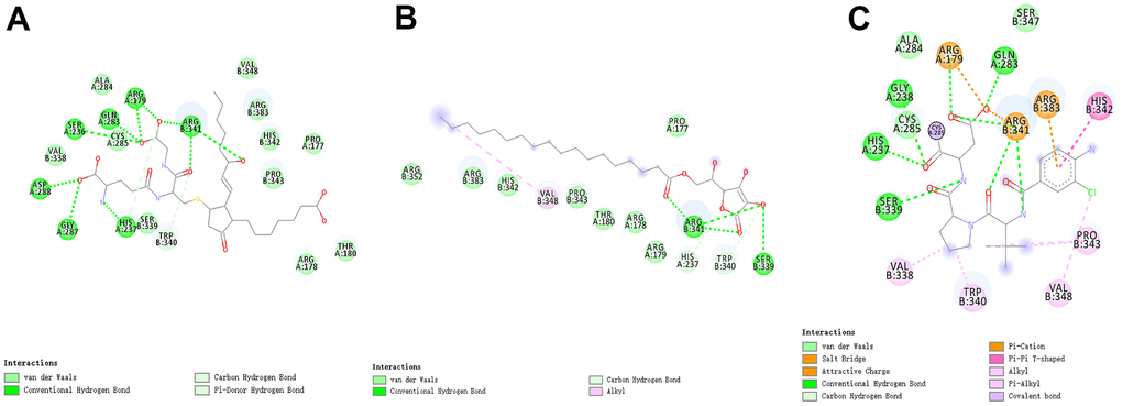 To show the interaction between ligand and protein in detail, the interaction bond, including bond type, bond length, and bond atoms, were analyzed explicitly by DS 4.5, as shown in Table 5. All chemical bonds, including Hydrogen bond interaction, Pi-Pi interaction, Pi-cation interaction, Alkyl interaction, and Pi-Alkyl interaction parameters for each molecule with Caspase-1 amino acid residues had been evaluated by DS 4.5 (Figures 3, 5, 6, and Table 5). The results tell that ZINC000004099068 formed ten pairs of Hydrogen bonds with Caspase-1 (O23-A: ASP288:OD1, O23-A: GLY287:O, N21-A: HIS237:HD1, O26-B: ARG341:HN, O7-B: ARG341:HN, O7-B: ARG341:0, O31-B: ARG341:HH21, O31-A: ARG179: HE, O30-A: GLN283:HE21, O30-A: SER236:O, respectively). Besides, ZINC000100634116 formed five pairs of Hydrogen bonds (O19-B: ARG341:HH12, O19-B: ARG341:HH22, O29-B: ARG341:HN, O29-B: SER339:O, O29-B: ARG341:HN, respectively). Only four pair Hydrogen bonds were formed in Belnacasan- Caspase-1 complex (O22-A: GLY238:HN, O22-A: HIS237:HD1, O20-B: ARG341:HH21, O20-A: ARG179: HE, respectively). Compared with Belnacasan, more Hydrogen bonds improve the interaction's affinity and stability between two selected molecules and Caspase-1. Additionally, Belnacasan formed one pair of Alkyl interaction and three pairs of Pi-interactions with Caspase-1, including Pi-Pi interaction, Pi-cation interaction, and Pi-Alkyl interaction. And no Pi-Alkyl interaction, Pi-cation interaction, and Pi-Pi interaction was formed by Caspase-1 and ZINC000004099068, ZINC000100634116. All these binding interactions above were analyzed by Schrodinger and PyMol software further (Figures 3, 5–7). In conclusion, these results imply that ZINC000004099068 and ZINC000100634116 may have a better binding affinity with Caspase-1 than Belnacasan, indicating the promising application of these two compounds.