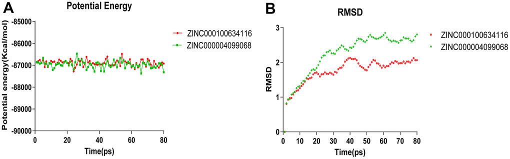 Molecular dynamics simulation was carried out in a simulated natural environment to evaluate the stability of the ZINC000004099068- Caspase-1 complex and ZINC000100634116- Caspase-1 complex. As is shown in Figure 9, the potential energy and RMSD of each compound become stable over time, while the trajectories of complexes reached equilibrium after 50 ps. The result proved that the pi-pi interactions and hydrogen bonds between these compounds and Caspase-1 were conducive to the stability of complexes. In the end, we conclude that these compound- Caspase-1 complexes could maintain stable existence in the natural environment and regulate Caspase-1 activity.