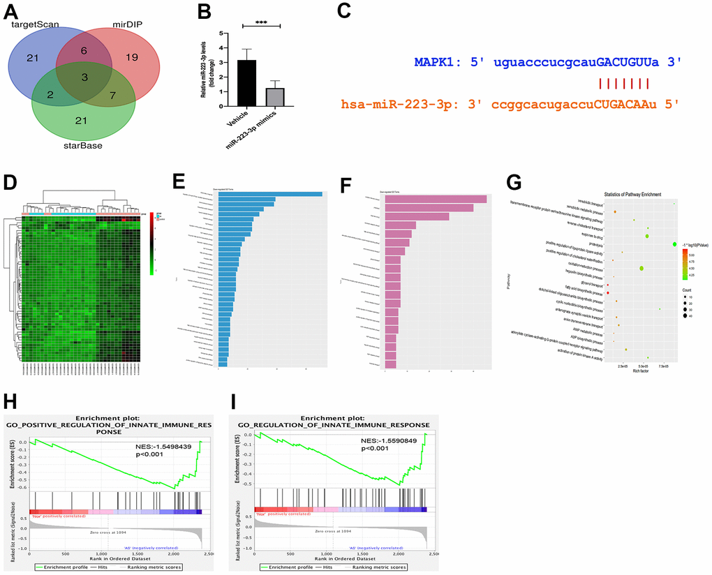 Given that miRNAs exert their function by reducing their downstream expression of target genes [24]. The variety of functions of miR-223 has been linked to the suppression of many different target genes in inflammatory pathologies [25, 26]. Therefore, miR-2233p may affect cell differentiation and activation by suppressing its target genes, which have been protective against inflammatory response. We obtained three potential genes (PLAGL2, FLOT2, and MAP2K1) of miR-223-3p by combining the results from the online miRNA target prediction databases (Figure 3A). To confirm whether the three potential genes were the downstream target genes for miR-223-3p, we examine the expression of the three potential genes in macrophages transfected with miR-223-3p mimics. The qPCR results revealed that MAP2K1(MEK1) expression was noticeably decreased in macrophages transfected with miR-223-3p mimics (Figure 3B). Furthermore, miRDIP and starBase databases were applied, and we found miR-223-3p and MAP2K1 had targeted binding regions (Figure 3C). There results suggested that MAP2K1 was a direct target of miR-223-3p. Upon activation, Raf mediates phosphorylation of MEK1 and MEK2, which in turn phosphorylate ERK1 and ERK2 [27]. Thus, we hypothesize that the regulation of miR-223-3p may be through the MEK/ERK signaling pathway in atherosclerosis. To assess the inflammatory response signaling pathway in AS, we downloaded the GSE34822 dataset from the GEO database, comprised of atherosclerosis samples. As shown in Figure 3D, 158 up-regulated differentially expressed genes (DEGs) and 206 down-regulated DGEs were obtained using the criteria of Padj < 0.01, |log2FC| > 1.2, hierarchical clustering analysis exhibited the distinction on differentially expressed genes in the heat map. We then performed pathway analysis by David and established Go enriched up-regulated pathways (Figure 3E), including inflammatory response, metabolic process, lipid transport, and intracellular protein transport. We also found down-regulated pathways, including anion transmembrane transport, glycerol transport, and ADP biosynthetic process. (Figure 3F) Correspondingly, relevant partial results for KEGG pathways were exhibited in Figure 3G. Furthermore, the gene set enrichment analysis (GSEA) revealed that the innate immune pathway regulation was functionally enriched in AS (Figure 3H, 3I). Thus, we pick up miR-223-3p, MEK/ERK1/2, and the inflammatory response pathway for further investigation.