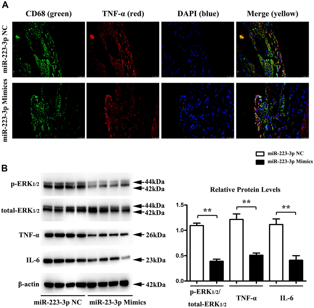 Double-immunofluorescence was performed on carotid tissues from 223-3p mimics and the NC mice group. As shown in Figure 4A, the double-immunofluorescence exhibited significant co-localization of the macrophage marker CD68+ and TNF-α, suggesting that the macrophages express TNF-α in miR-223-3p mimics (Figure 4A). To further investigate the possible role of miR-223-3p in the inflammatory response of AS, protein expression changes in mice carotid tissues were determined by quantitative analysis and western blots, respectively. We found significantly decreased expression levels of inflammatory cytokine (IL-6 and TNF-a) in carotid tissues from the miR-223-3p mimics group in western blots (Figure 4B). Additionally, we also found significantly reduced p-ERK1/2 expression level in miR-223-3p mimics. (Figure 4B). The quantitative analysis of relative protein expression confirmed the associated decrease in the protein levels of IL-6, TNF-a, and ERK1/2 in carotid tissues of miR-223-3p mimics as compared with the NC group (Figure 4B, P<0.05), suggesting that miR-223-3p mimics could repress inflammatory response and phosphorylation ERK1/2 in AS.
