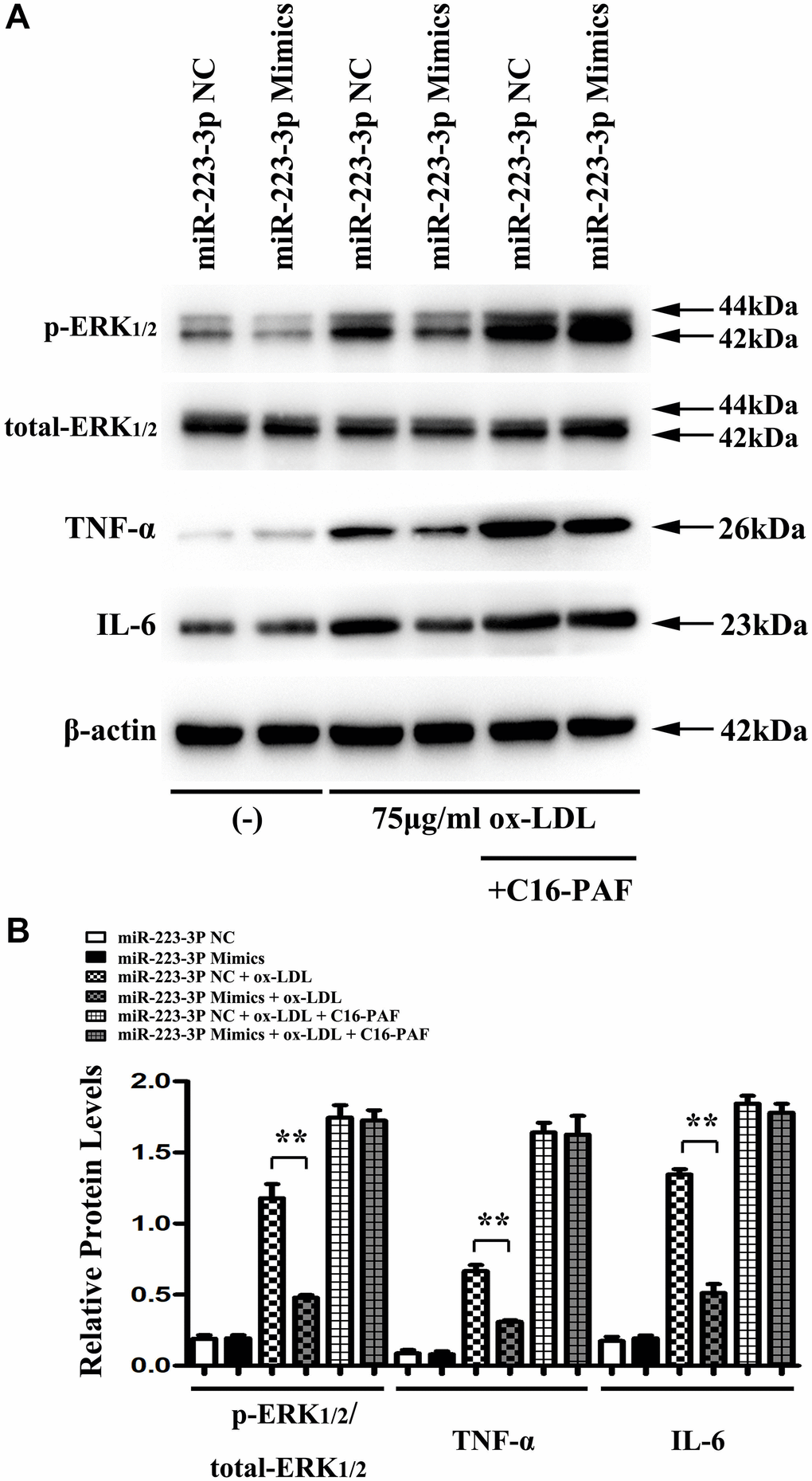 The macrophages might initiate and exacerbate inflammation with ox-LDL stimulation and prompt the destabilization of the atherosclerotic plaques [28]. To investigate the biological importance of ERK1/2 as a target of miR-223-3p, miR-223-3p mimic/NC-transfected macrophages were stimulated with ox-LDL and saline to detect the ERK1/2, IL6, TNF-a expression in in vitro. Using western blots, we found that the expression levels of p-ERK1/2, IL6, and TNF-a were significantly suppressed in miR-223-3p mimic-transfected macrophages with ox-LDL stimulation as compared with miR-223-3p NC-transfected macrophages with ox-LDL (Figure 5A). The result of in vitro implied that miR-223-3p mimic could repress the inflammatory response in AS. To further determine whether miR-223-3p mimic mediated inflammatory effect in ox-LDL stimulated macrophages was via ERK1/2 signaling pathway, C16-PAF, an ERK1/2 agonist was injected into the culture medium of the miR-223-3p mimic/NC-transfected macrophages with ox-LDL stimulation. Interestingly, we found that the decreased expression levels of p-ERK1/2, IL6, and TNF-a in miR-223-3p mimic-transfected macrophages with ox-LDL were markedly reversed by C16-PAF, suggesting that miR-223-3p mimic mediated inflammatory effect in ox-LDL stimulated macrophages was via ERK1/2 signaling pathway (Figure 5A). As shown in Figure 5B, the quantitative analysis of relative protein expression was consistent with our western blot analysis data (P<0.05, Figure 5B). Therefore, these data suggested the essential role for ERK1/2 as a mediator of the biological effects of miR-223-3p-mediated inflammatory effect in AS.