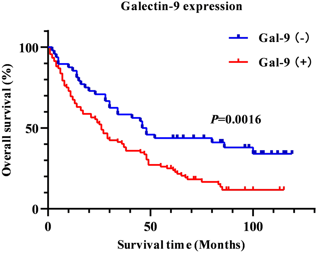 We performed statistical analysis using SPSS 23.0 statistic software (version 23.0, IBM, Armonk, NY, USA). Descriptive statistics, such as mean, standard deviation, and absolute and relative frequencies, were calculated to define the basic characterizations of the study cohort. Chi-squared test was performed to evaluate the association between the expression of Gal-9 and patients’ clinicopathological features. We generated survival curve by Kaplan-Meier method and compared them by log-rank test. Then, the hazard ratios with their 95% confidence intervals (CI) were evaluated by Cox proportional hazards models. P < 0.05 was regarded as statistically significant.