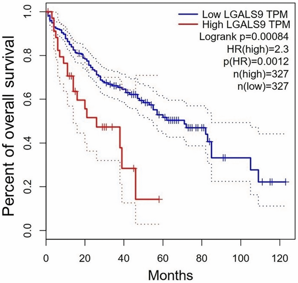 Recent years, Gal-9 has been found to have prognostic value in certain cancer types. For example, in pancreatic cancer, Sun et al. reported that higher Gal-9 expression was associated with better disease-free survival (DFS) and overall survival (OS) [10]. For breast cancer, Irie et al. found that patients with Gal-9+ tumors had a more favorable DFS than patients with Gal-9- tumors, and lower Gal-9 expression could predict a relatively higher risk of metastasis [11]. In ovarian cancer, Schulz. et al. found that moderate expression of Gal-9 could predict poorer outcome than Gal-9 negative cases, however, it seemed that patients with strong Gal-9 expression predicted best outcome [12]. In lung adenocarcinoma, patients with high Gal-9 expression had shorter survival time than patients with low or negative Gal-9 expression [13]. In sum, the prognostic value of Gal-9 is inconsistent in different cancer types.