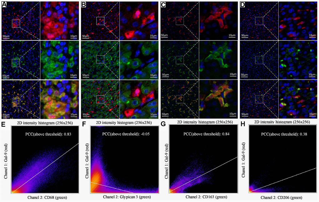 Quantitation of the colocalization between Gal-9 and CD68, GPC3, CD163, CD206 was analyzed by Coloc 2 of Fiji (ImageJ, 1.52i, National Institutes of Health, USA). Detailed procedures about IF staining evaluation are provided in Supplementary Materials.