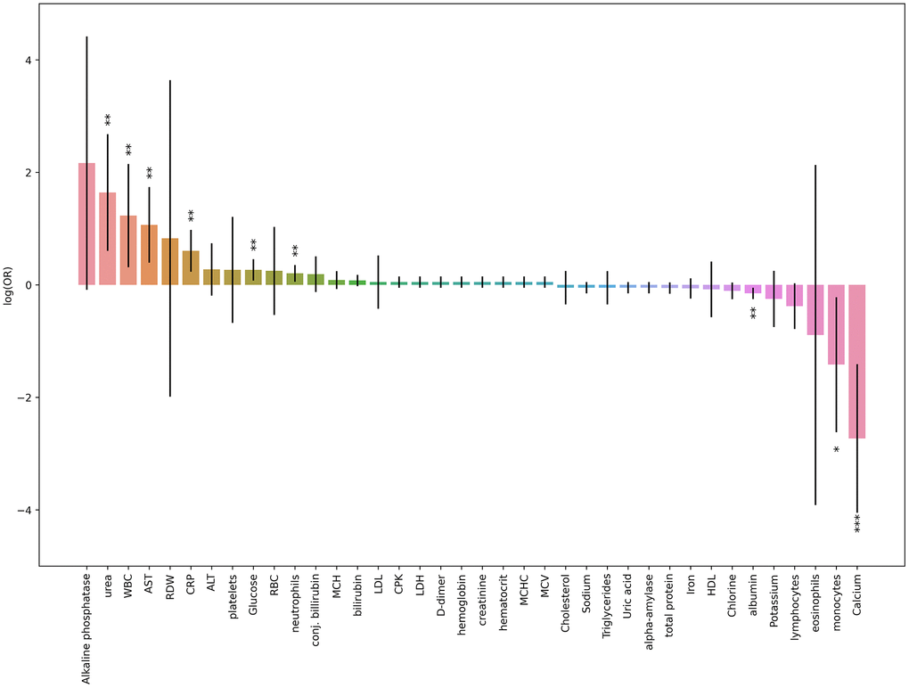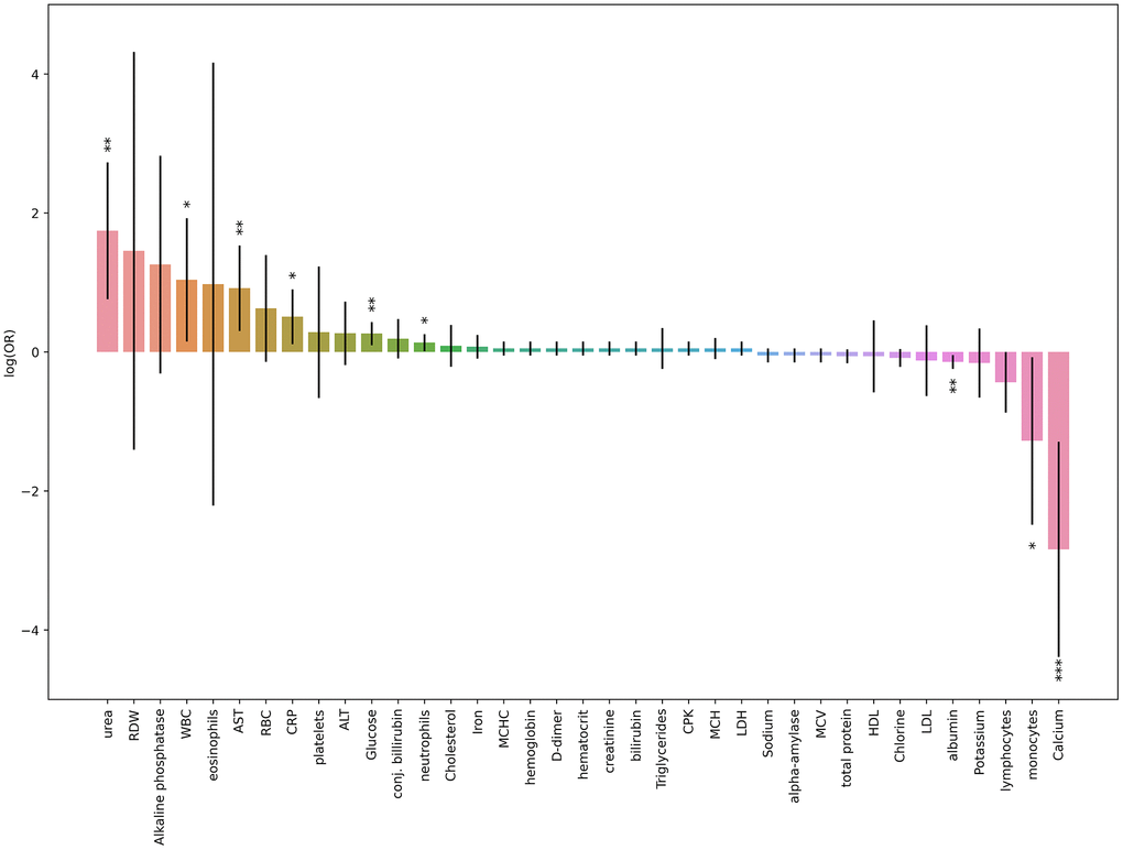 First, we performed a three-factor logistic regression analysis with age and sex adjustments to evaluate the association between each cell blood count or biochemical parameters and COVID-19 outcomes (Figures 1, 2).