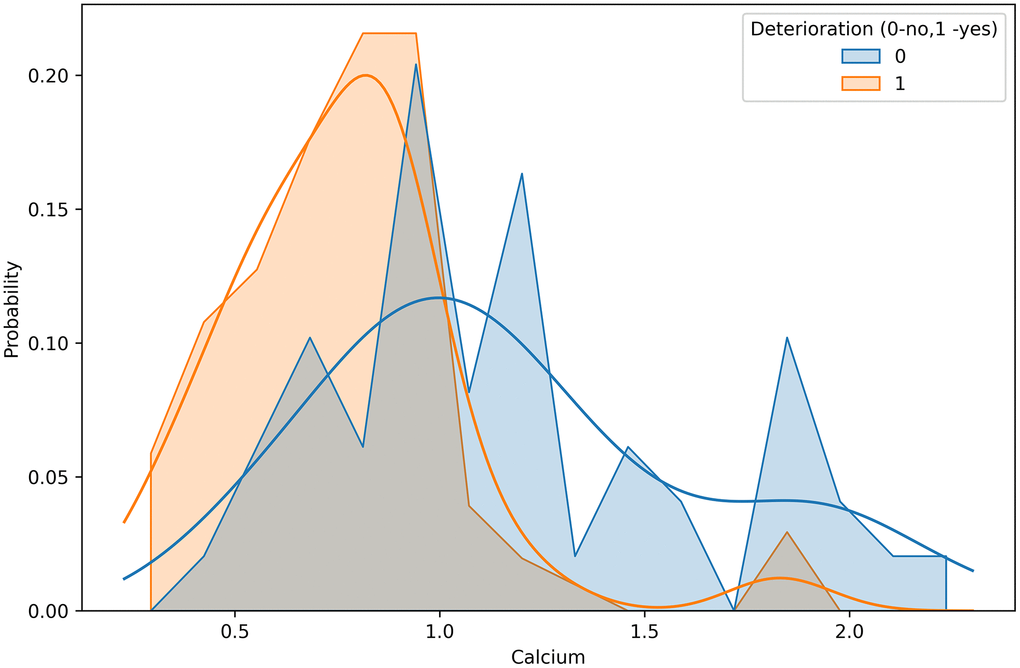 The most significant association was revealed for calcium level. Low calcium levels were strongly correlated with death and deterioration in patients with COVID-19 (Figure 3). In contrast, the levels of inflammatory markers, urea, liver enzymes, and glucose were increased in the patients with high deterioration and death risks.