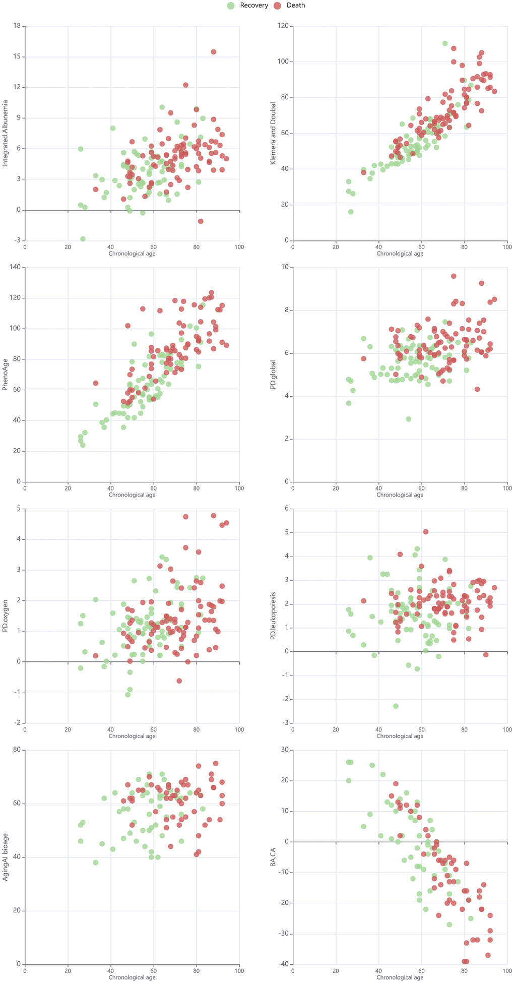According to existing data, various calculations for assessing physiological state and biological age can be considered promising predictors of the severity of the course of COVID-19 [5], including measures of the biological age, such as the PhenoAge (PA) and Klemera-Doubal method (KD), integrated albunemia, and physiological dysregulation. In a study by Kuo et al. based on data from the UK Biobank, accelerated aging calculated using the PA 10–14 years before the onset of the COVID-19 pandemic was associated with all-cause mortality in patients with COVID-19 [6]. Differences in the methods used to calculate the physiological states may influence their predictive power. Therefore, to determine the most informative method for assessing physiological state or biological age in relation to the prognosis of COVID-19, it is necessary to conduct comparative studies. In this study, we aimed to assess whether different multivariate metrics of physiological state could predict the outcomes of COVID-19 better than the chronological age.