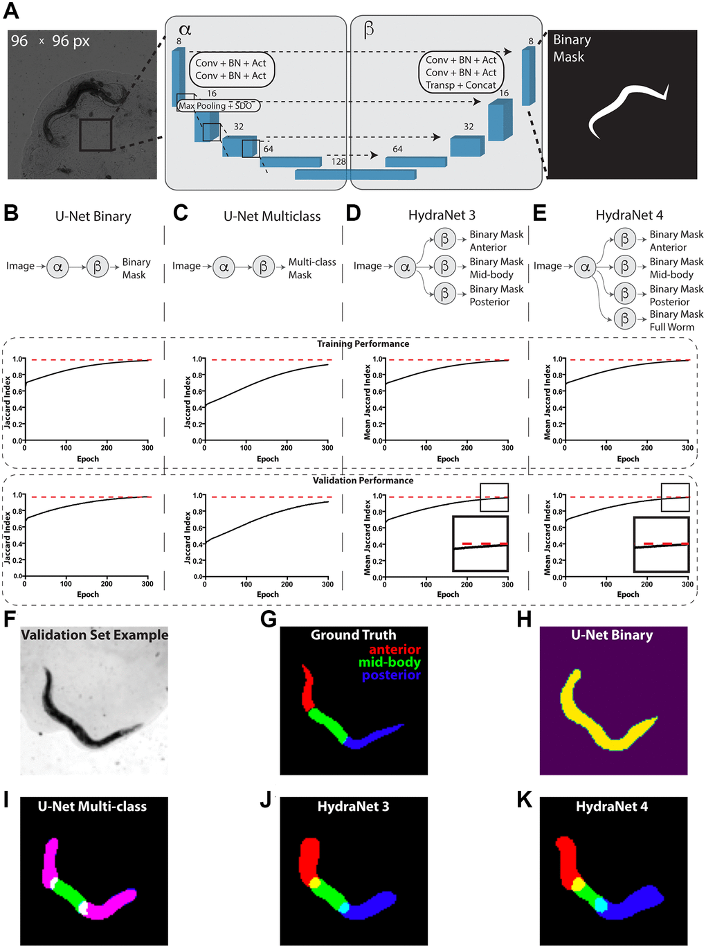 Remarkably, one aspect multi-class U-Net did not perform well was distinguishing anterior and posterior parts of the worm which led to generating overlapping masks (Figure 1I). To circumvent this limitation, we have designed an alternative architecture using U-Net α and β parts, with multiple β parts dedicated each for its own binary segmentation problem (Figure 1D, 1E), which we called HydraNet. Such approach creates a jointly trained architecture with common input layers and layers dedicated for each of the morphological parts of the worm, allowing to have an end-to-end model, while solving a simpler binary classification problem. HydraNet3 was equipped with 3 β parts dedicated to the anterior, mid-body, and posterior parts of the worm body. HydraNet4, in turn, was equipped with 4 β parts dedicated to the anterior, mid-body, posterior parts as well as the whole worm body. To estimate joint performance of HydraNet we measured Jaccard index for each β part individually and finally evaluated the average Jaccard index. Remarkably, both HydraNet3 and HydraNet4 achieved the average Jaccard index 0.97 on both the train and test fractions demonstrating good generalization (Figure 1D, 1E, 1J, 1K). Noteworthy, HydraNet4 achieved conversion earlier than HydraNet3 (Figure 1D, 1E insets) suggesting a potential positive effect from accompanying the architecture with a more general semantic class.