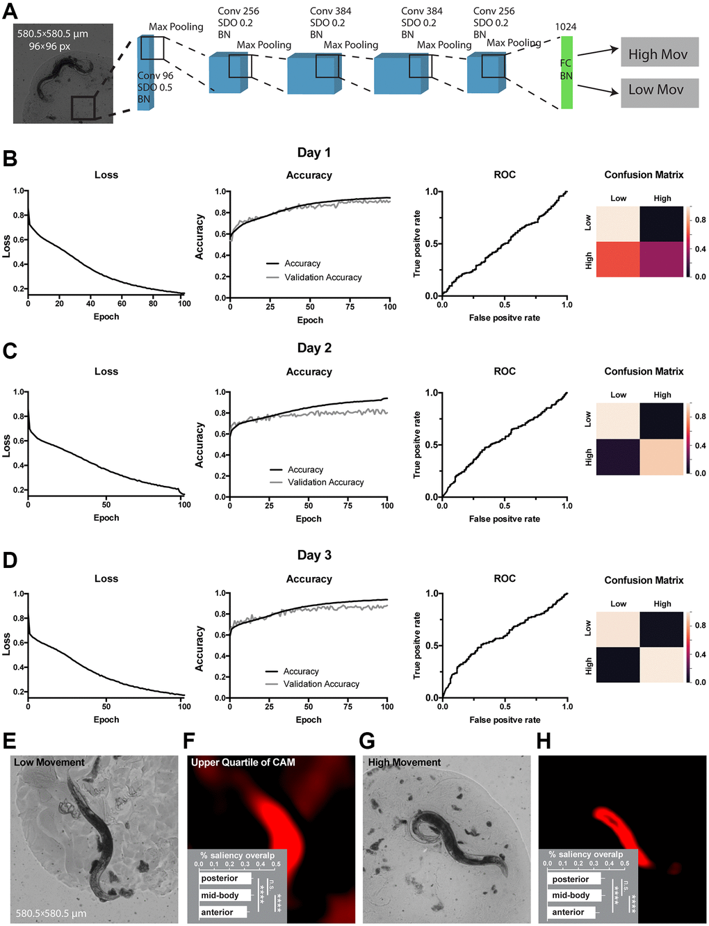 Here we worked with the dataset generated in Pincus lab [8, 15], and showed that the application of newly designed WormNet was able to successfully discriminate between short and long-lived worms even for images taken at day 1 or day 2; importantly, for day 3 the CNN demonstrated the best performance (Figure 2A–2C). WormNet was even better at classifying worms with high and low total movement, achieving 88% accuracy for day 1 adults (Figure 3). We expect that generating more data and developing the CNN architecture could further improve the performance of WormNet by decreasing overfitting and bias.