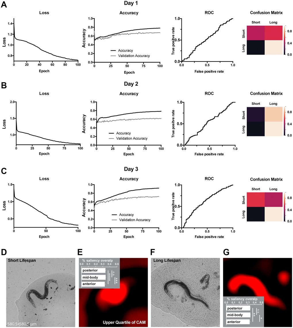Next, we used WormNet to classify long and short-lived worms. Similarly to movement classification, the WormNet performed better on day 3 adults sample reaching accuracy of 72% (precision 0.73, recall 0.71, AUC ROC 0.61) on the test dataset, as compared to AUC ROC of 0.53 and 0.52 for day 2 and 1 respectively. The confusion matrix analysis suggested that the CNN underperformed in short-lived worms classifying (Figure 3A–3C). Next, we have interpreted the classifier using the tandem of HydraNet4 and WormNet accompanied by a one-way ANOVA statistical test. In the case of lifespan classification, by-design interpretation suggested that at 32% the anterior part was significantly less pronounced in CAMs compared to the mid-body and the posterior part (Figure 3D, 3E – short lifespan, Figure 3F, 3G – long lifespan). This difference was less significant for long lifespan than for short lifespan. There was no significant difference between the mid-body and the posterior part.
