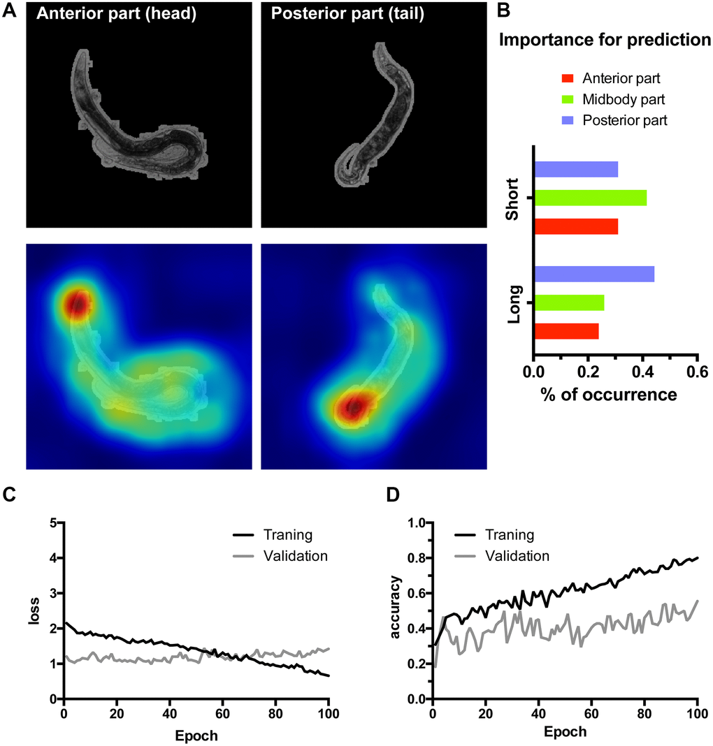 To verify these findings in an independent manner we have trained another lifespan classifier using the residual InceptionV3 architecture [33] accompanied by a manual interpretation (Figure 4). Furthermore, in this case to ensure high resolution of the CAMs instead of scaling to 96 × 96 pixels, the full resolution 900 × 900 images cropped to 800 × 800 pixels (516 × 516 μm) were used. As a much higher expressive capacity CNN, InceptionV3 was prone to overfitting on our relatively small dataset (Figure 4C, 4D). To circumvent this, we have implemented early stopping during training. Additionally, we segmented the worms from their background ensuring InceptionV3 is presented only with the relevant part of the image. InceptionV3 performed similarly to WormNet with the accuracy reaching 70% on the test dataset for lifespan classification (Figure 4A). Consistently with the tandem HydraNet4-WormNet approach to interpretation, in the case of the manual interpretation, the anterior part of the worm was highlighted by the InceptionV3 CAM less frequently. Importantly, however, due to the higher resolution of the input images, the CAMs now localized the body parts much better, allowing to assign a body part as a possible discriminator in each case (Figure 4B). Interestingly, the distribution of the body parts highlighted by CAM’s analysis demonstrates that the posterior part is more important for long-living worms’ classification, suggesting that the features predicting longevity could be located in the posterior part of the worm body.